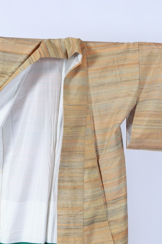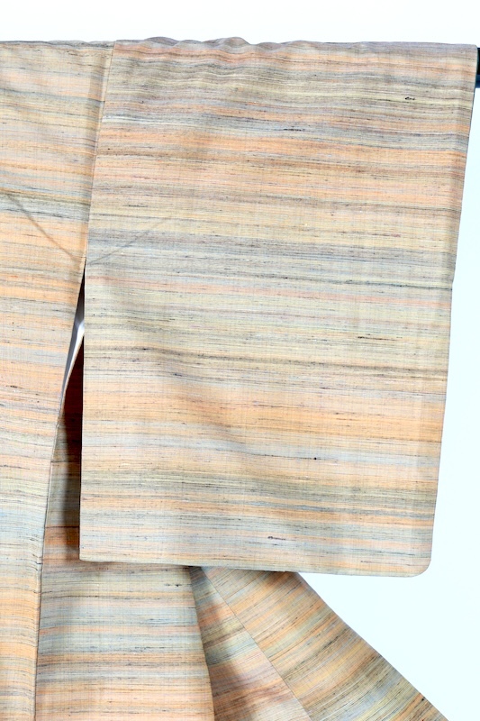 草木染めのコックリした優しい色合いを横段に手織りした自然の恵みをたっぷりいただき織り上がった素晴らしいお品をオシャレに着こなしてお出かけください。