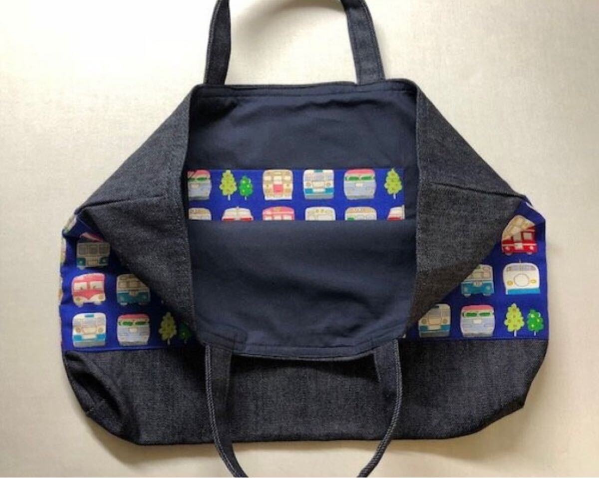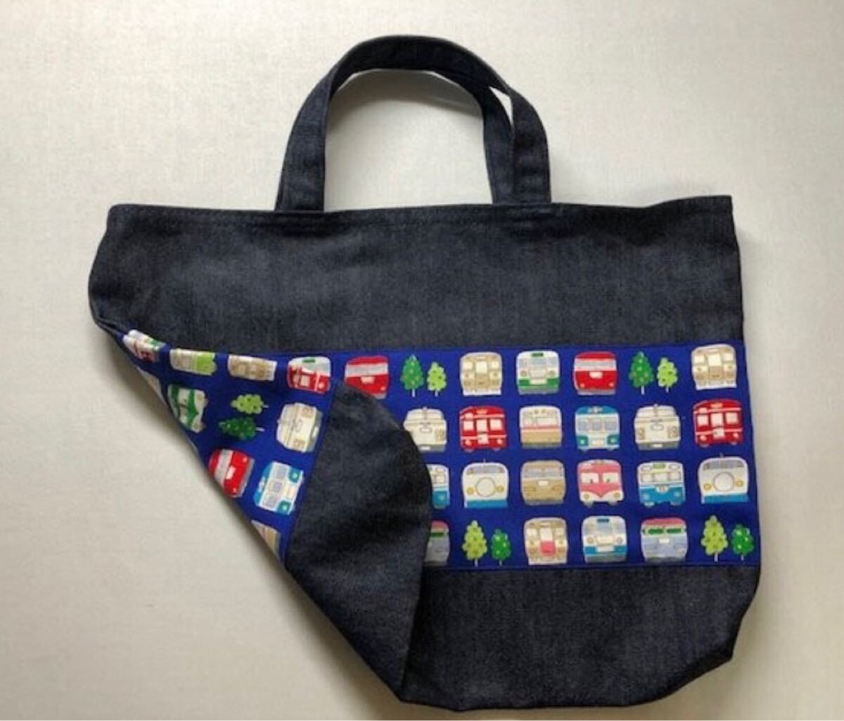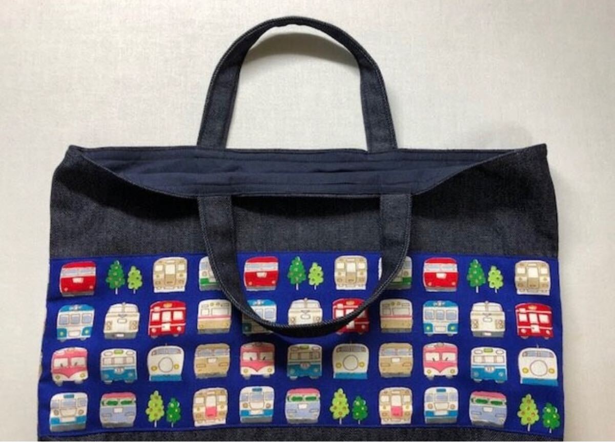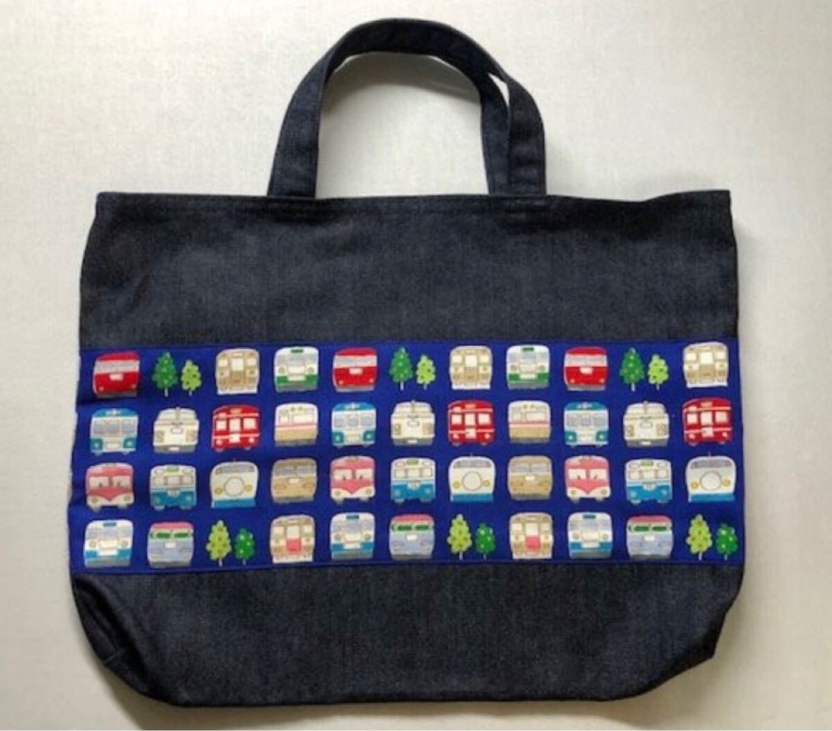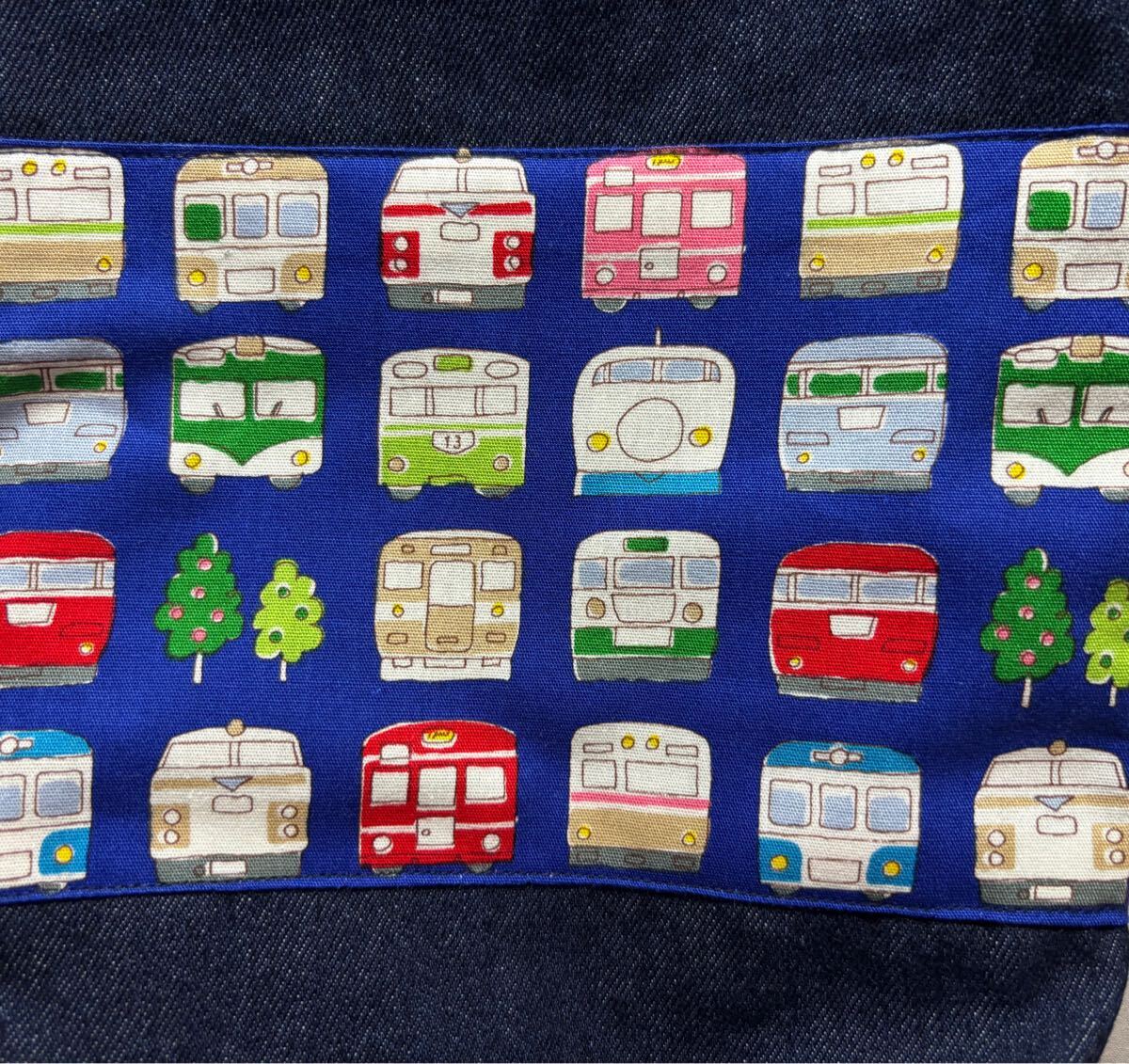 紺デニム生地に、かわいい電車柄の生地を合わせて作成しました。8オンス薄地ですが、しっかりした生地です。