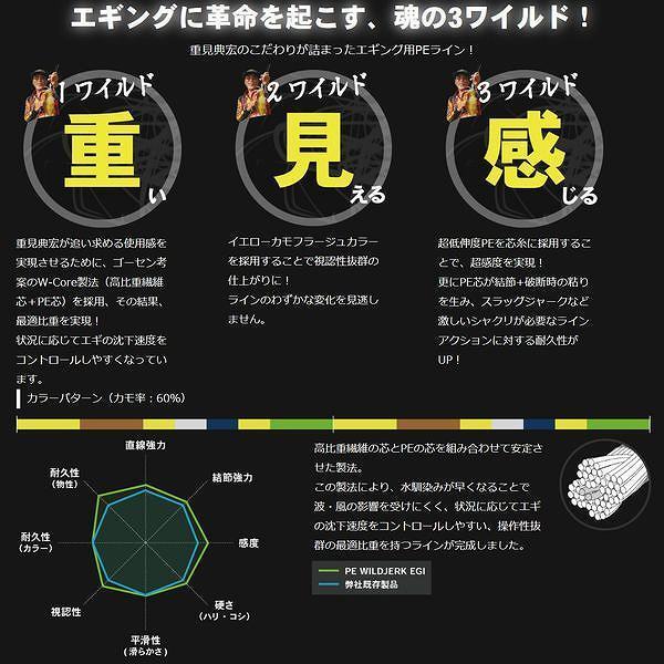 3 ワイルド「感」じる … PE×PE芯=超感度!超低伸度PEを芯糸に採用し、わずかなアタリも逃さない。