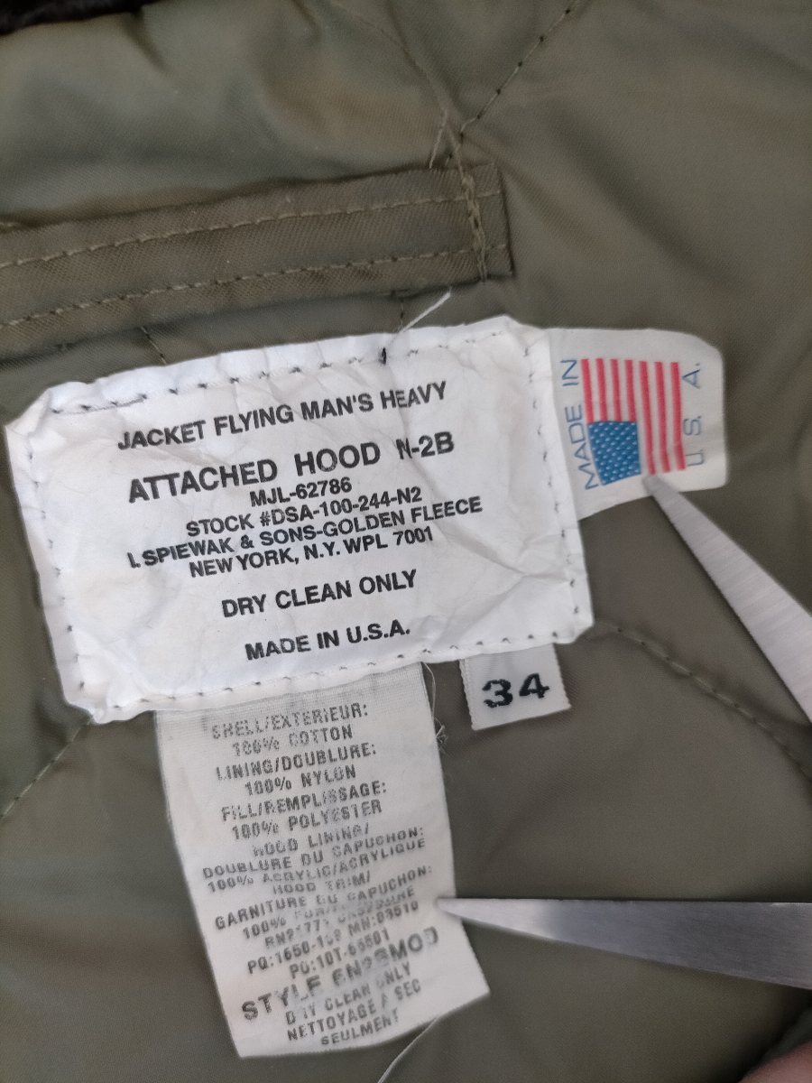 90s USA製 ビンテージ SPIEWAK GOLDEN FLEECE スピワック ゴールデンフリース ダック生地 N-2B フライトジャケット size-34 ★ミリタリー
