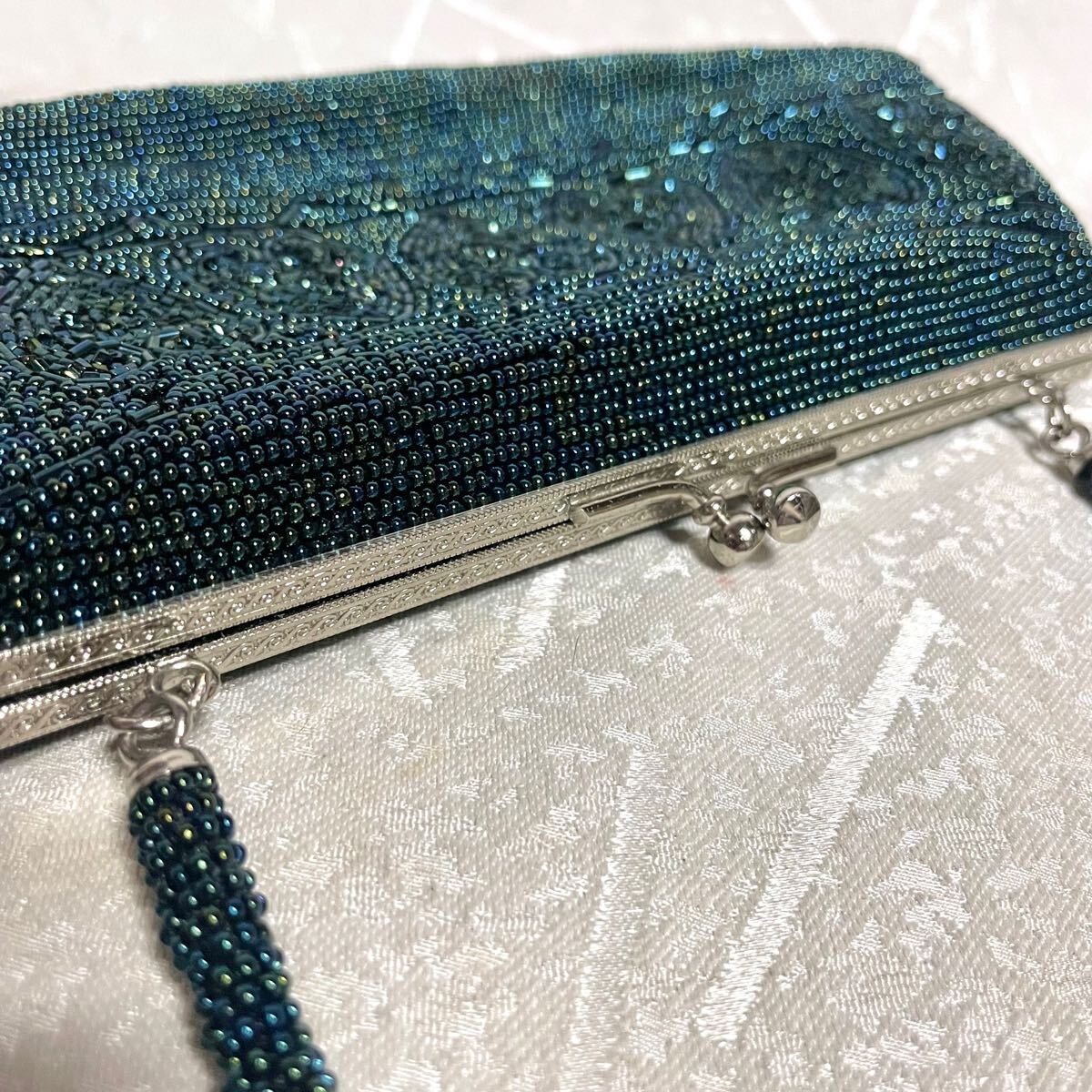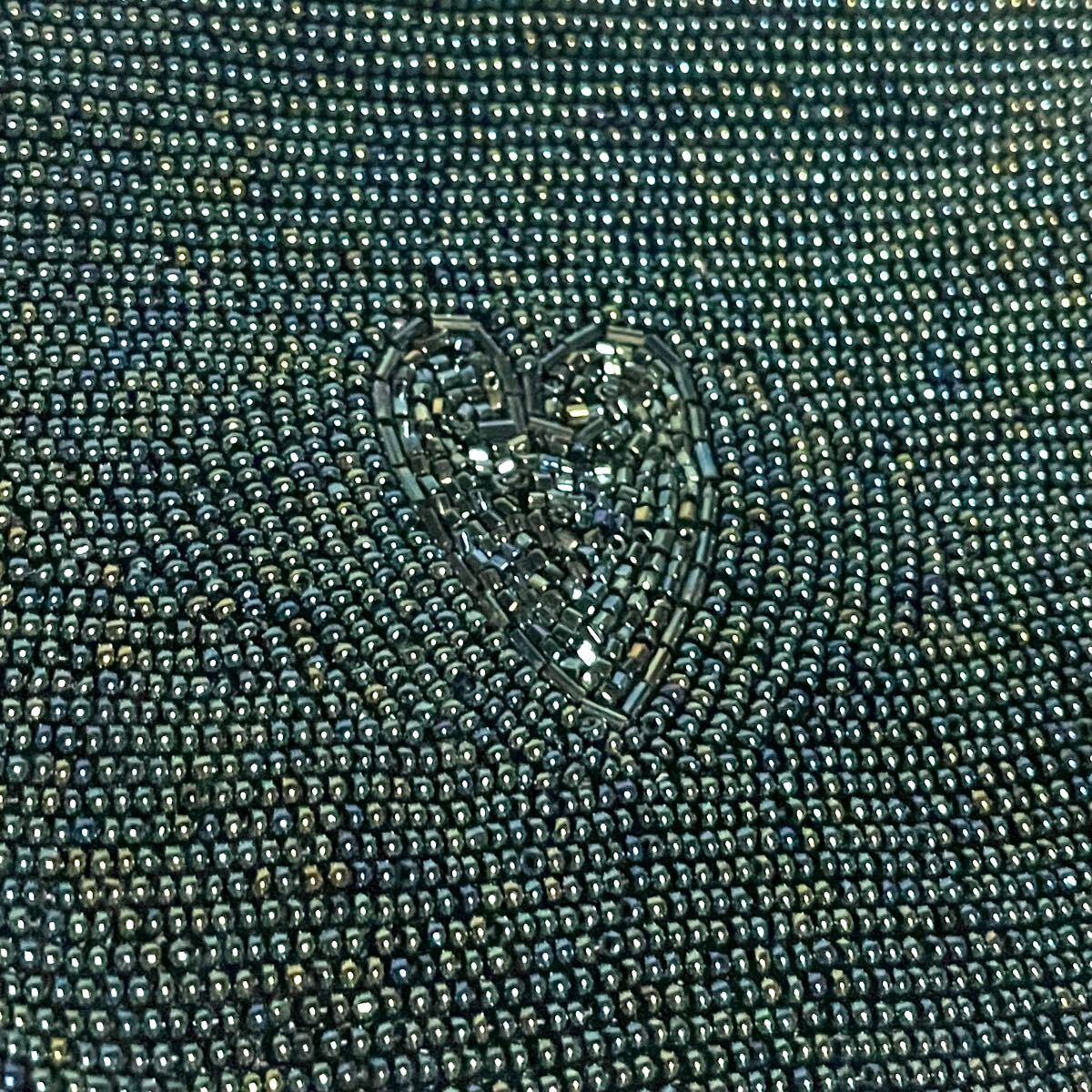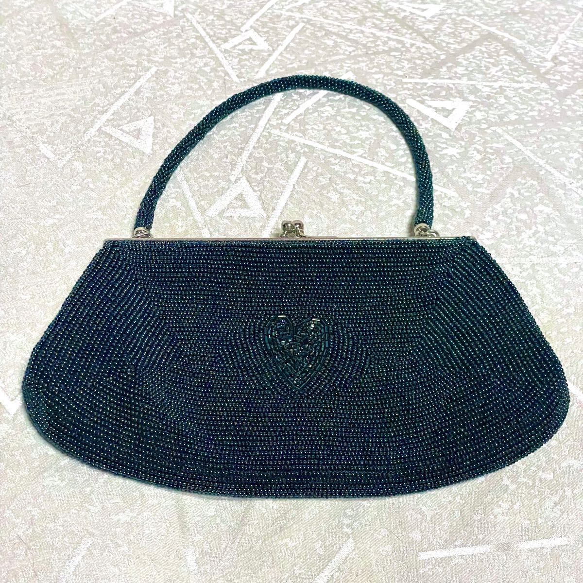 1回使用【総ビーズ】ビーズバッグ ハート 猪目 がま口バッグ パーティバッグ 緑系 グリーン系 和装 ★留袖、振袖などにも