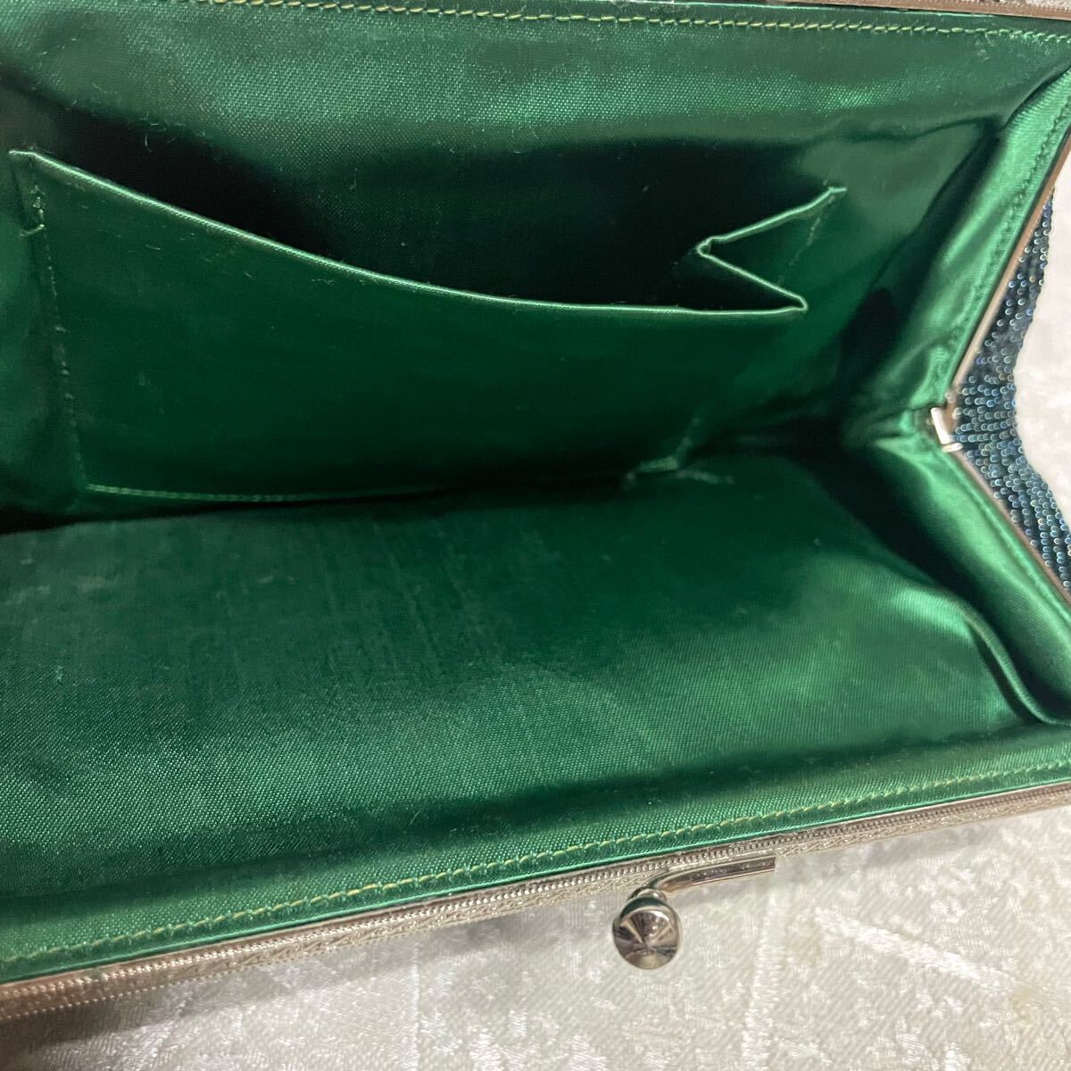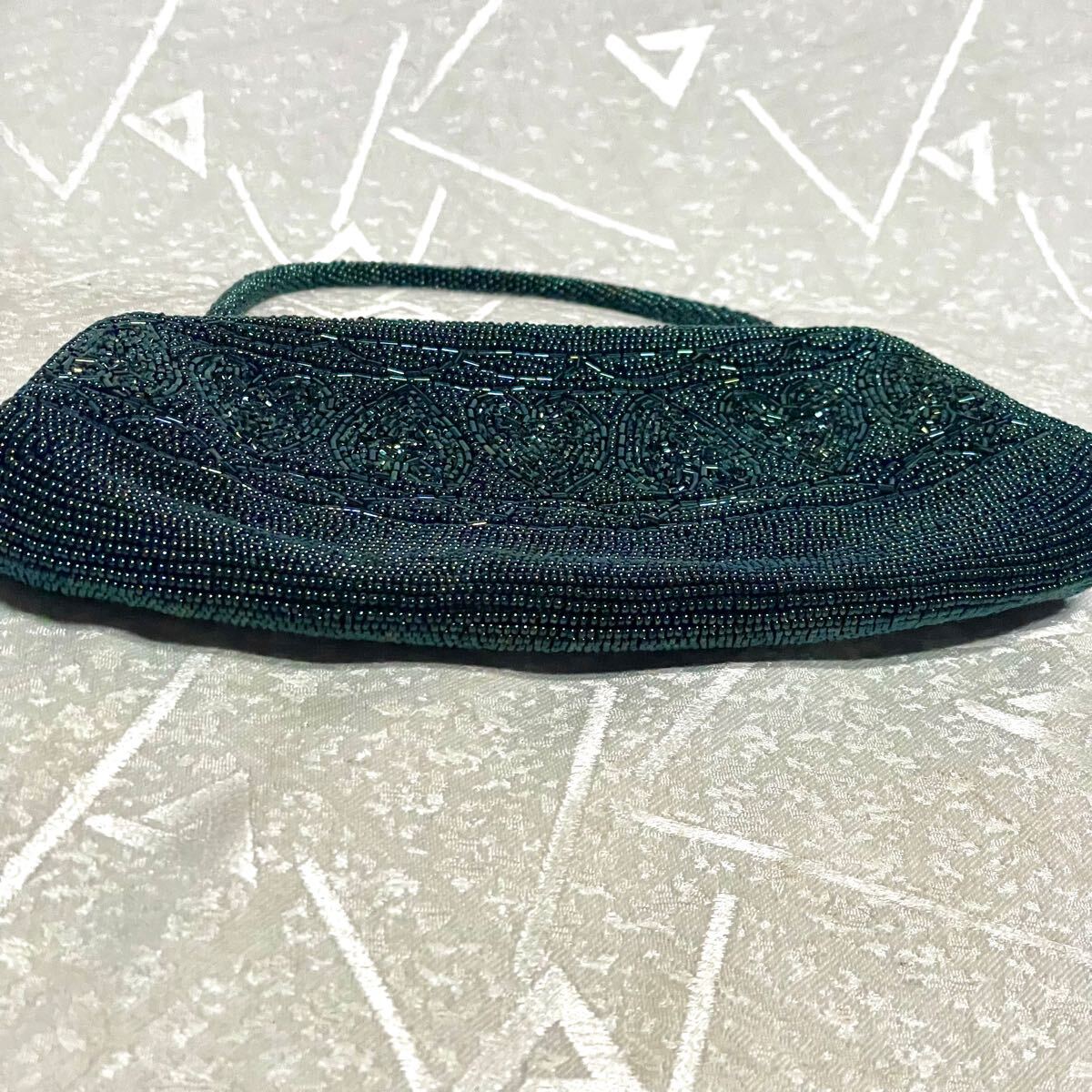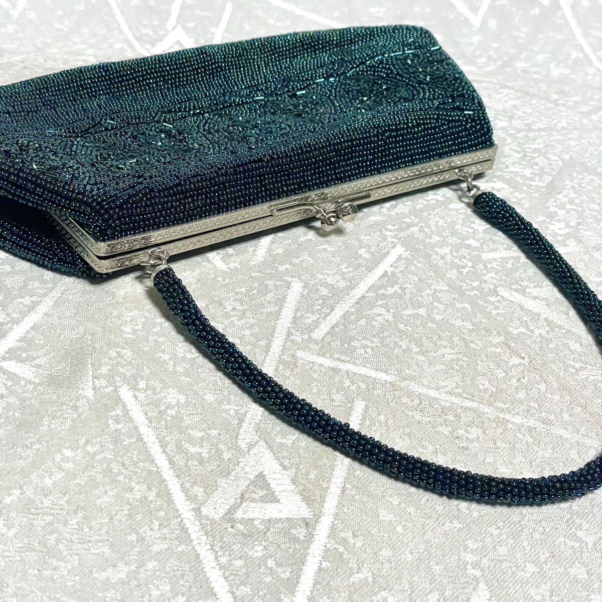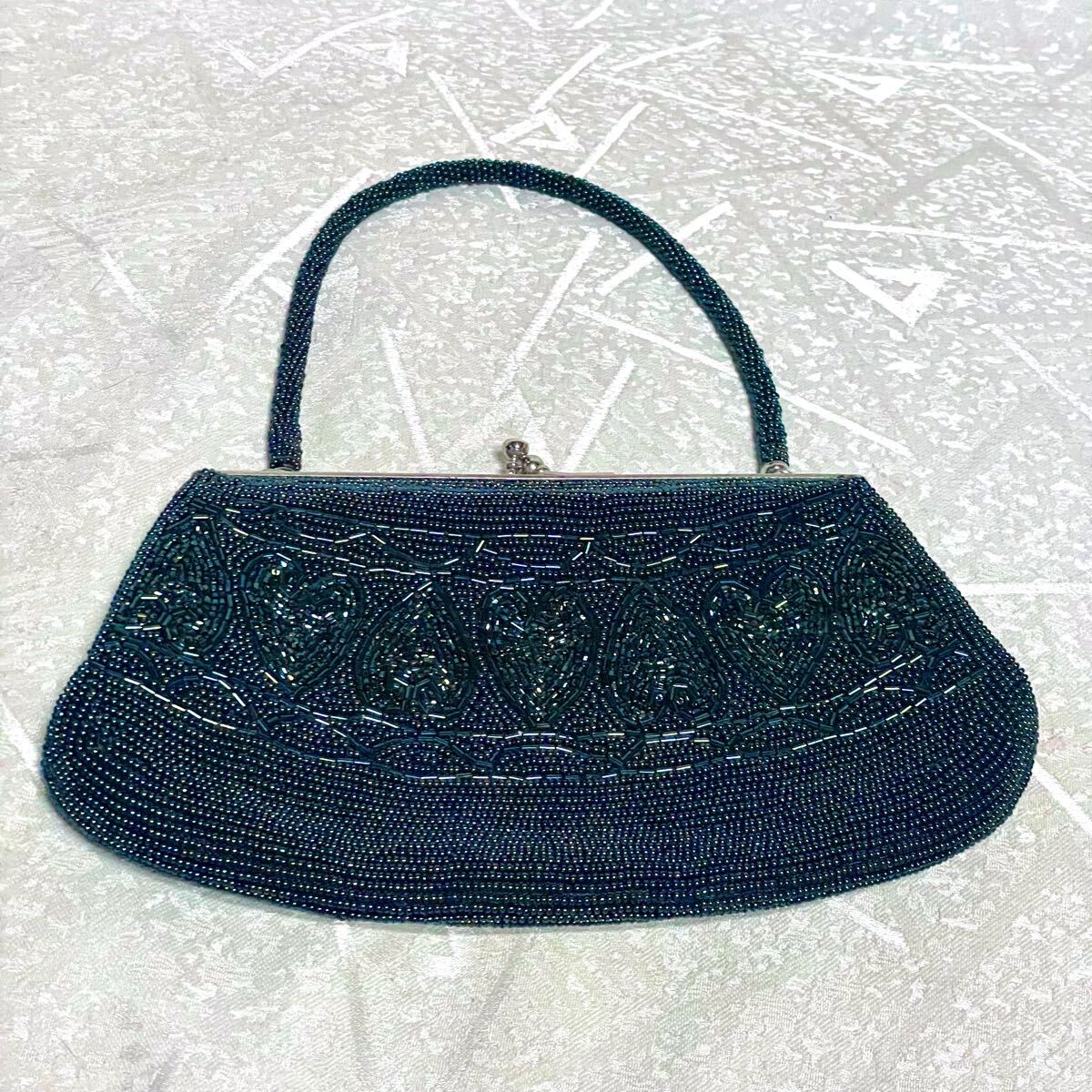 1回使用【総ビーズ】ビーズバッグ ハート 猪目 がま口バッグ パーティバッグ 緑系 グリーン系 和装 ★留袖、振袖などにも