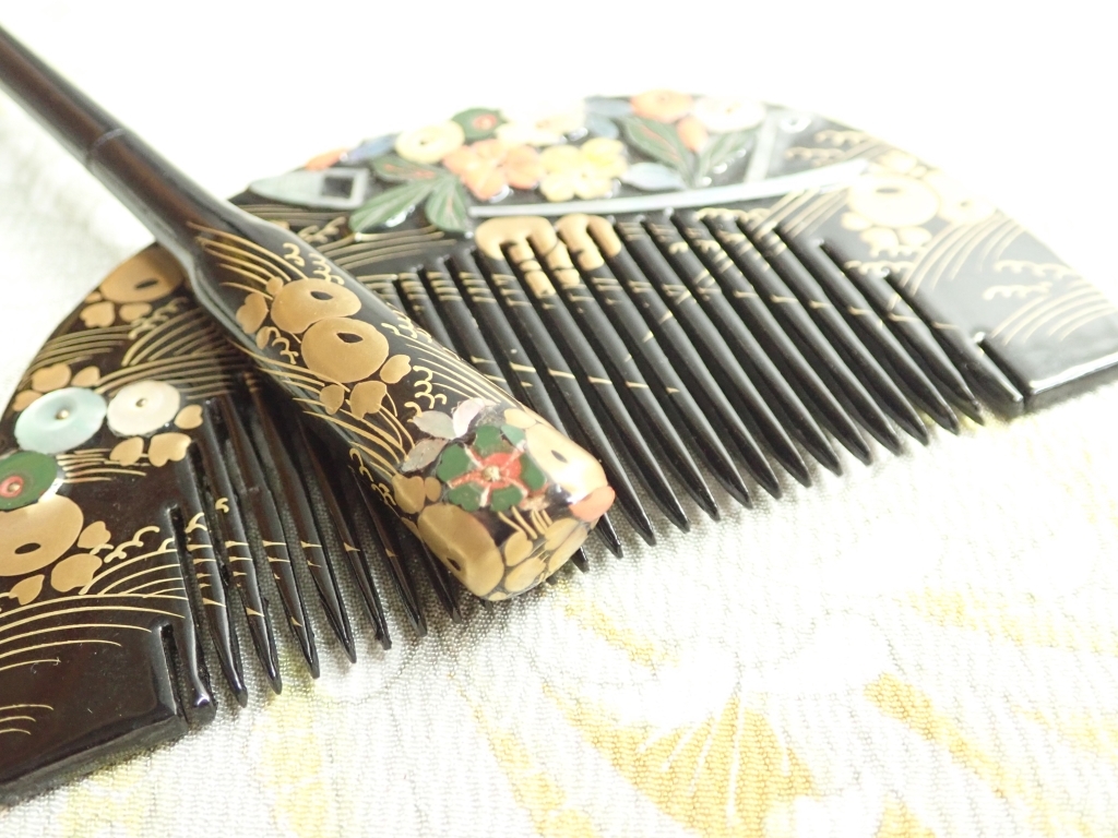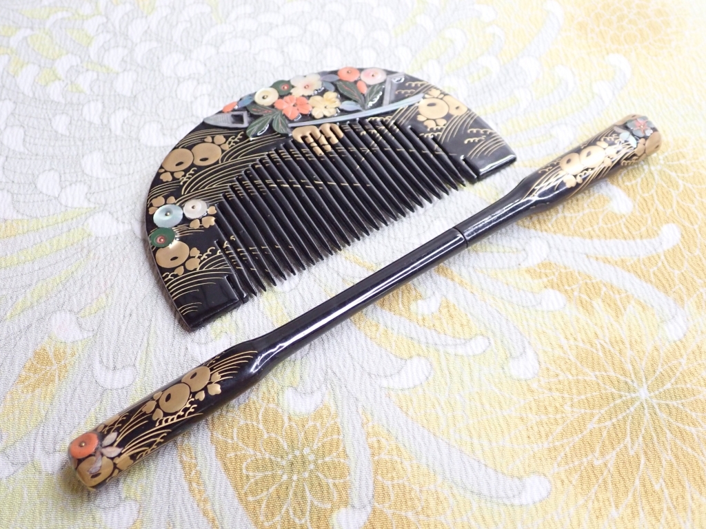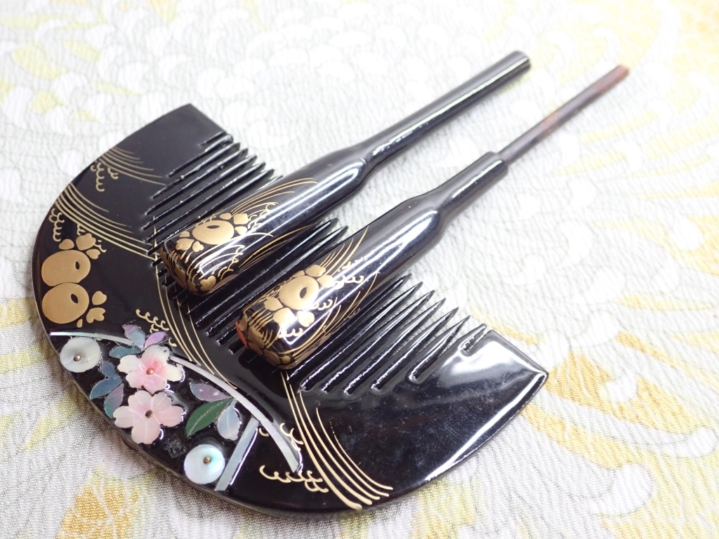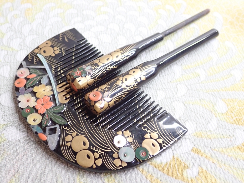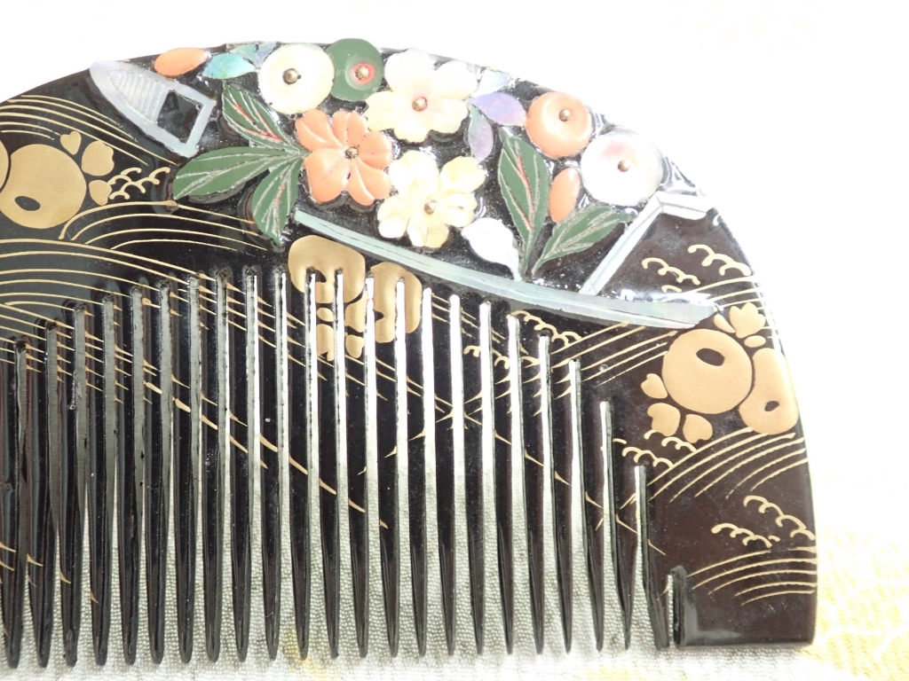 A505 櫛/笄 木製黒塗金蒔絵 流水に小舟と螺鈿花飾り レトロ/かんざし/簪和装小物/着物 Japanese Kimono Jewelry