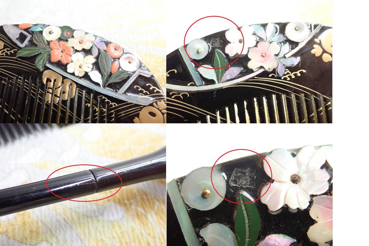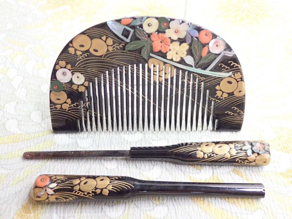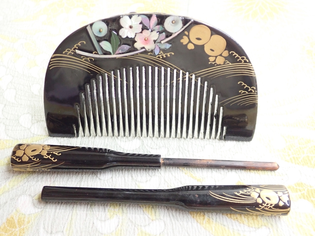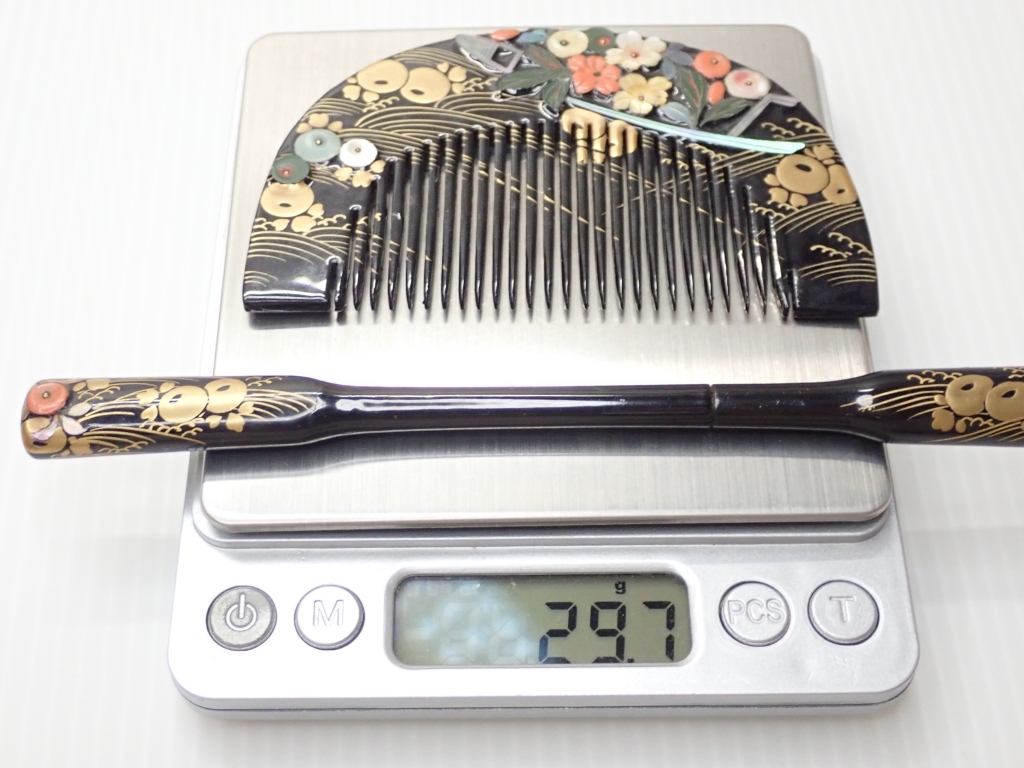 A505 櫛/笄 木製黒塗金蒔絵 流水に小舟と螺鈿花飾り レトロ/かんざし/簪和装小物/着物 Japanese Kimono Jewelry