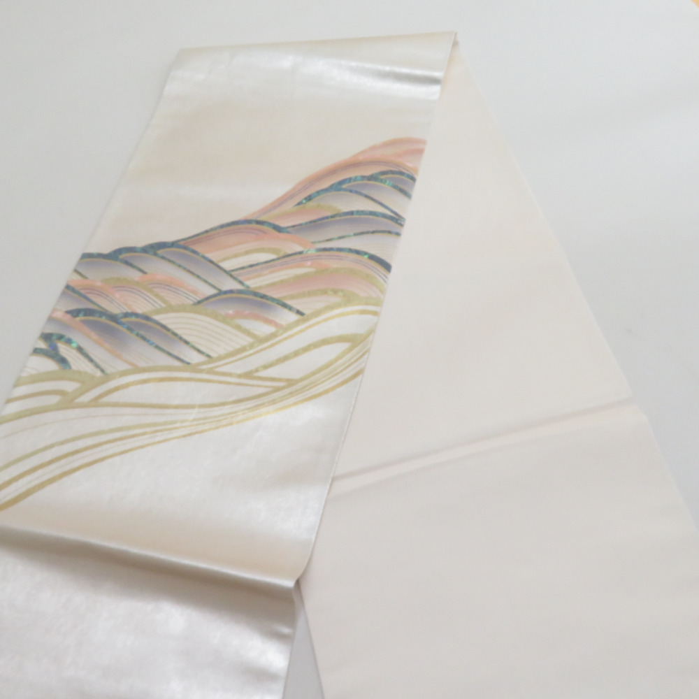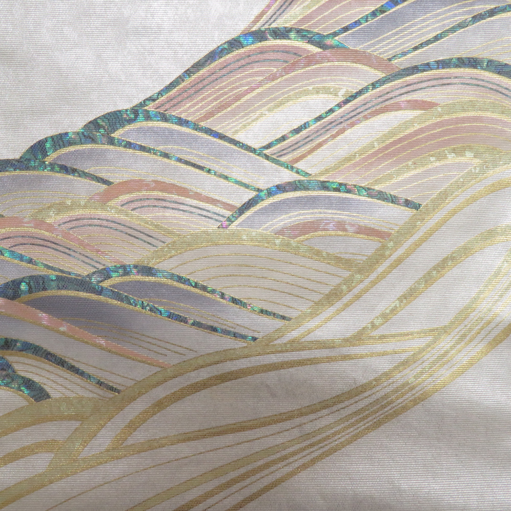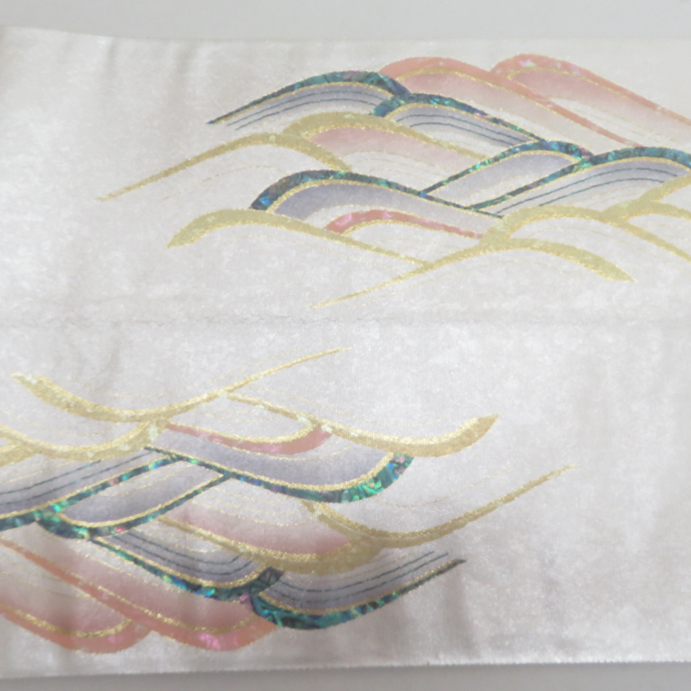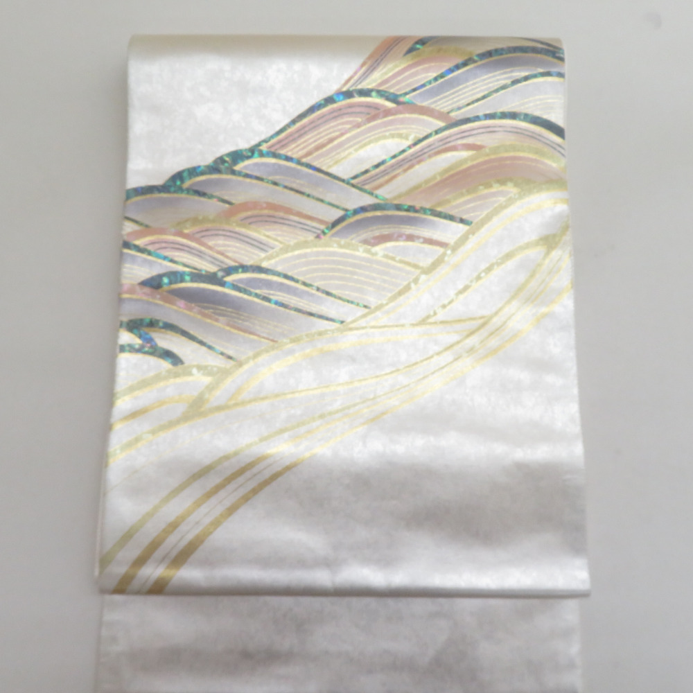 | 袋帯 正絹 螺鈿入り 波模様 パール系 ゴールドx白xピンクベージュx多色 お太鼓柄 正絹 仕立て上がり 着物帯 長さ440cm |