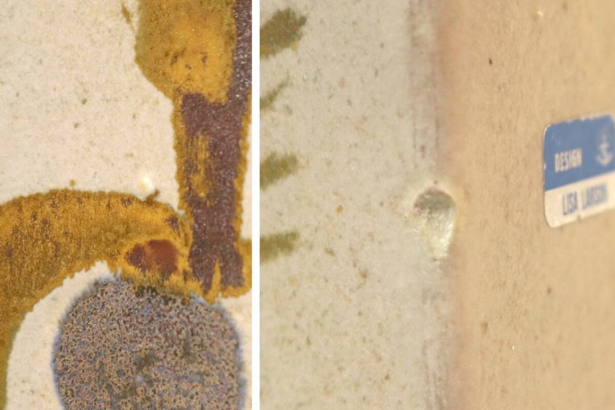 割れや欠け、ひび、補修痕などは無く、ヴィンテージとしては大変良いコンディションです。 画像の白い部分や色の薄い部分は光の反射によるもので色抜けなどは有りません。 使用に伴う疵などはほぼ見られず、使用感は殆んど感じられません。 側面に欠片の付着、エッジに素地の凹みが見られます。(9枚目画像参照) ヴィンテージ品には釉薬ロスやスポット、色斑、小さな窯疵や歪みなどが見られる場合も有りますが、これら が製造された時代の製造技術、出荷基準では通常品扱いで販売されたものとして、ご理解をお願い致します。 経年や使用に伴う劣化、汚れ、疵などについては、出来るだけ詳細に説明をしていますが、細かな状態の全て を記載することは出来ません。 また、状態についての受け止め方は個人によって其々異なりますので、ご不 明な点など御座いましたらどうぞご遠慮なくお問い合わせ下さい。 |