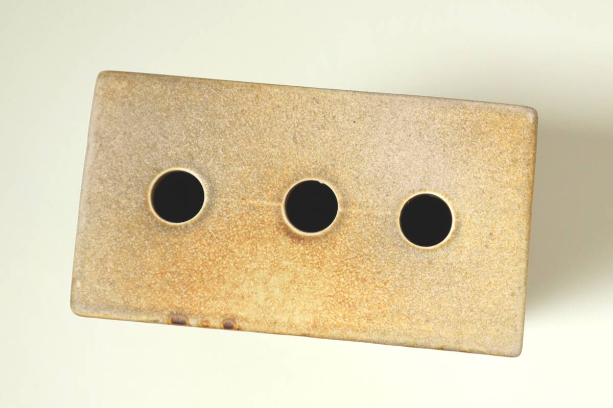 シリーズ・名称:ユニークピース Ladvas 箱型の花器 デザイナー:Lisa Larson リサ ラーソン メーカー:Gustavsberg グスタフスベリ 製造年代:1970年代 サイズ:約 W15,0×D8,3×H23,2cm 素人の平置採寸・計量ですので、誤差はご了承下さい。 素材:陶磁器 カラー:ライトフォーン・カーキー・ブラウン・マウスグレー 他 お使いのモニタ ーにより多少色目が異なると思いますが、ご了承下さい。 シール:錨とGUSTAVSBERG DESIGN LISA LARSON その他:3箇所の丸い投げ入れ口が開けられた四角い箱型の花器で、どっしりとした大きさと重みに存在感が 感じられます。 花器としては珍しいフォルムにのびのびと大胆なタッチで描かれた手描きの模様に は一部に特殊な釉薬が施され、角度によって現れる光沢の美しさが印象的なユニークピースです。 |