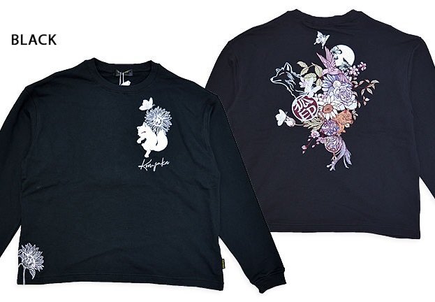 愛らしい狐のキャラクターが主役の【今昔】から「楽園スウェットトレーナー(KJ-29234)」のご紹介です。 長い季節着まわして頂くことの出来る裏毛スウェットを使用したトレーナーが登場しました! 今回は楽園をモチーフにした華やかなデザインです。 背中には花束を刺繍で表現しており、周囲には小鳥や蝶が舞っています。 お馴染みの今昔狐はアウトラインのみで落とし込みました。 バックにしっかり柄を入れている分、フロントはシンプルに仕上げ、メリハリを付けました。 左胸には今昔狐と花をワンポイントで刺繍しています。 ボディーには裏毛タイプのクルーネックスウェットを採用。 | ||||||||||||||||||||