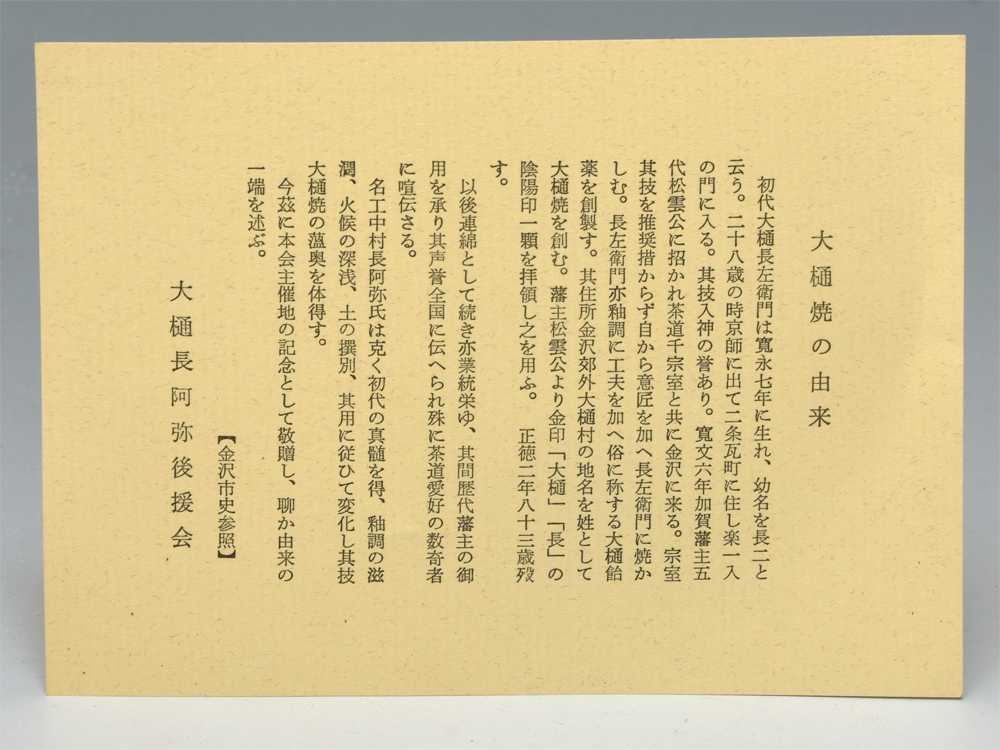 大樋長阿弥(造)大樋焼 飴釉 平茶碗です。 底部脇に銘「大樋」あり。 目立つ使用歴もなく状態は良好です。 ※撮影の際に生じた写り込みなどがございます。 ご理解の程よろしくお願い致します。 |