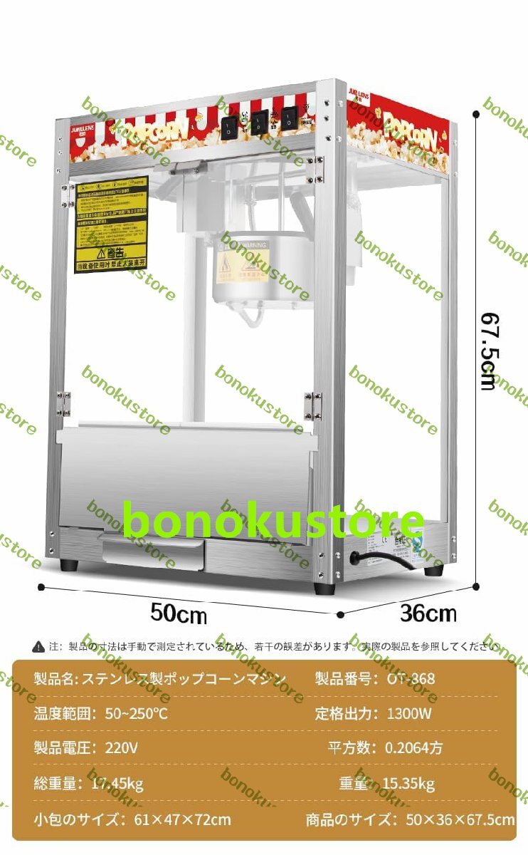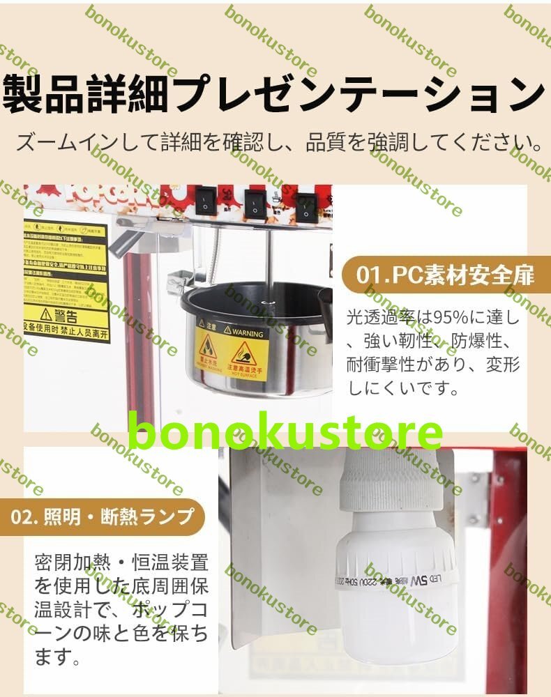 商品の説明製品説明 機械サイズ:36×50×67.5cm 電圧: 110v/220v 電力: 1300w 重量: 17KG 温度範囲: 50-250° 1、この製品は高品質のステンレス鋼、ガラス、アクリルで作られています。 高速かつ効率的なポップコーンマシン:熱風サイクロン技術、安全で効率的、熱風ポップコーンマシンの加熱室は均一で、熱風ポップコーンマシンのポップコーン率は99%と高いです。美味しいポップコーンをご家庭でもお楽しみください。 2、適用範囲:映画館、ホテル、レストラン、デザートショップ、スナックストリート、パーティー活動、商業用および家庭用に非常に適しています。 3、健康的な選択:ポップコーンメーカーは熱風を使用して、熱くて無料の新鮮なポップコーンを迅速かつ効率的に作ります。パーティー、大人数の集まり、静かなデートの夜に最適です。 4、使いやすくお手入れも簡単:ポップコーンマシンにトウモロコシの粒を入れ、スタートボタンを押すと、健康的なポップコーンが自動的に作成されます。コーティングは未精製で掃除が難しく、ぼろ布はボロボロでした。 5、ポップコーンはお客様のニーズに応じてさまざまなフレーバーで提供できます。砂糖、チョコレート、バター、海塩、ココナッツオイル、チーズ、ピーナッツバターなど。