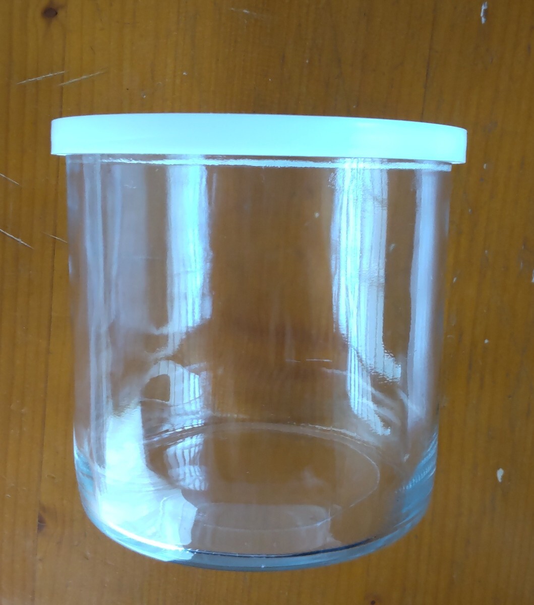 円柱のガラス瓶です、ふたはプラスチック製、しっかりとふたが出来ますあサイズ口径11.8cm 高さ11.5cm 中古品