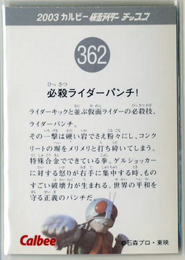 | ◆防水対策 厚紙補強 カルビー 仮面ライダーチップスカード(2003 復刻版) 362番 必殺ライダーパンチ! トレカ 即決 | |