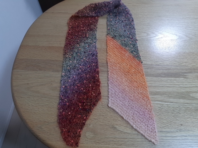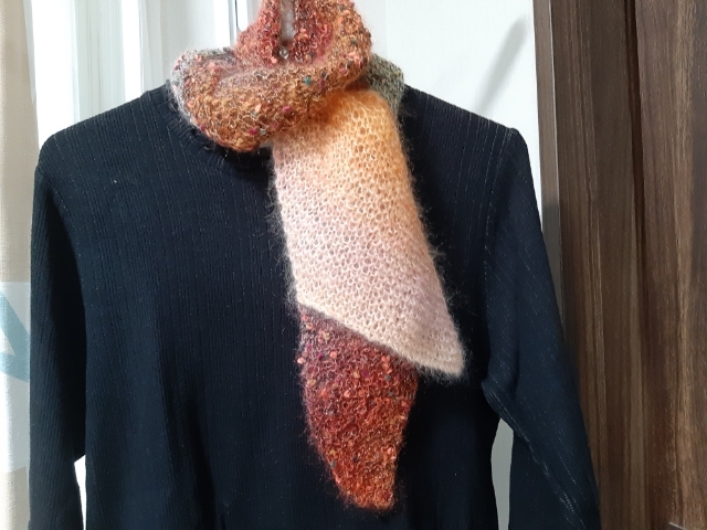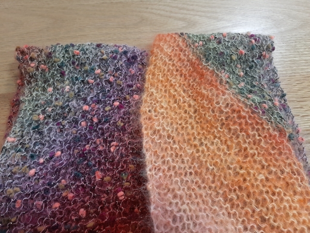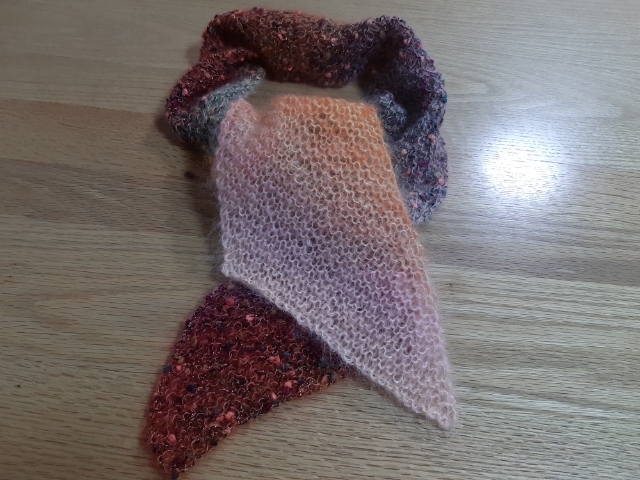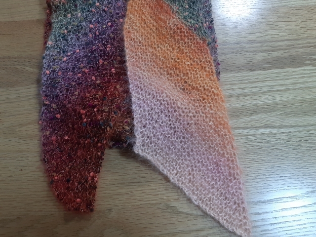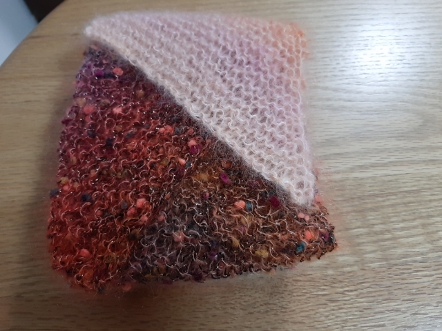 リッチモアの毛糸(グラデーションモヘアとトッピングモール)を2本引き揃えて編んでいます。
