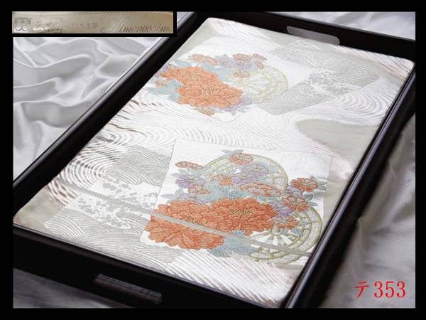 蔵【テ353】西陣美品 三松おりじなる帯 振袖可 色紙花車紋 シルバー色 正絹六通高級美術袋帯 ◇検◇簪着物名古屋帯和装小物帯締め