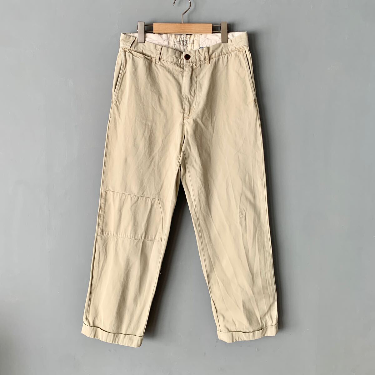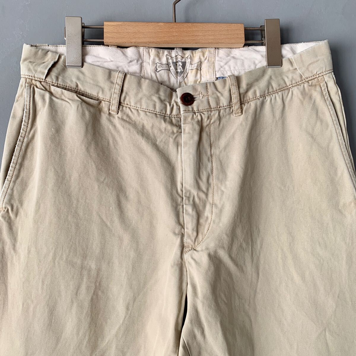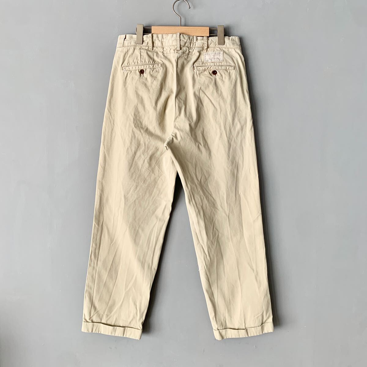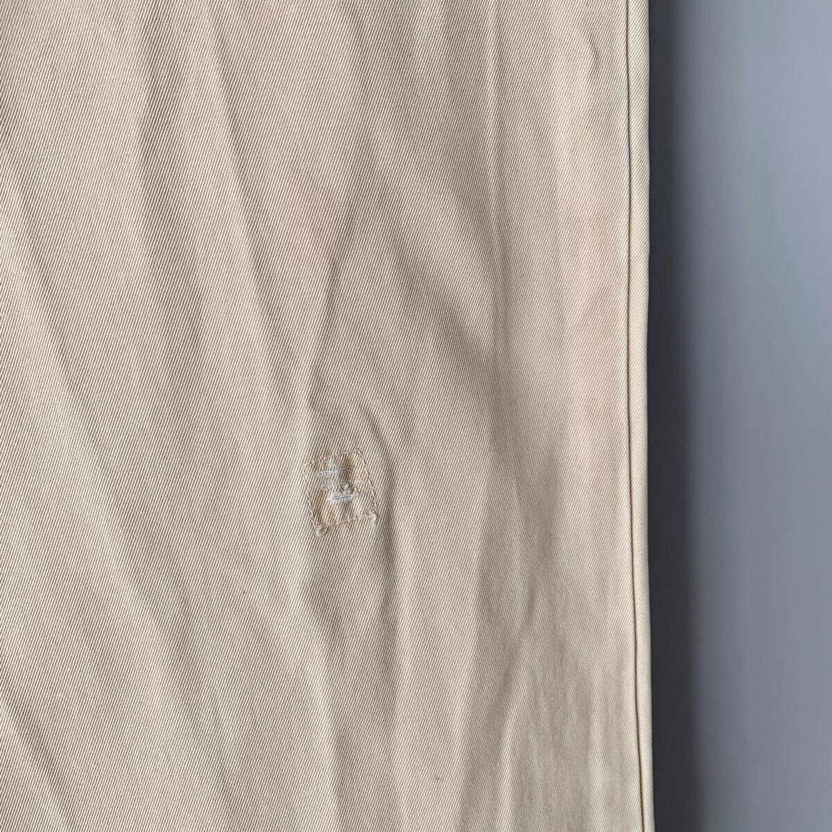 ラルフローレンのチノパンツです。ベーシックなトラウザータイプのチノに、膝に大きくリペア1箇所、小さいリペア2箇所、バックポケット袋の生地張り替えなど、程よいさじ加減のリアルなカスタムがほどこされています。(新品からのものです)