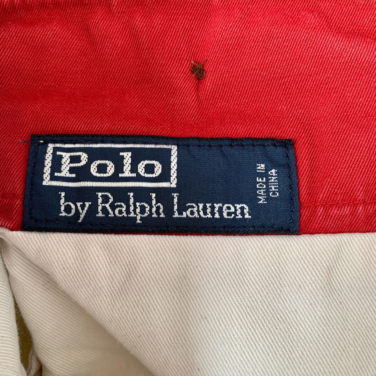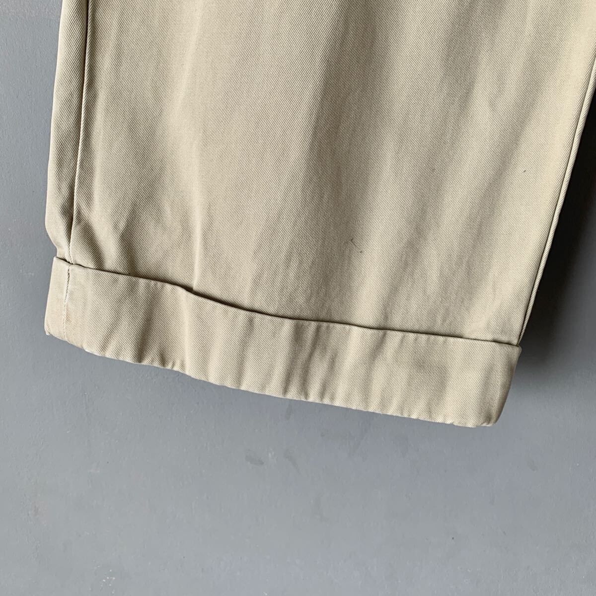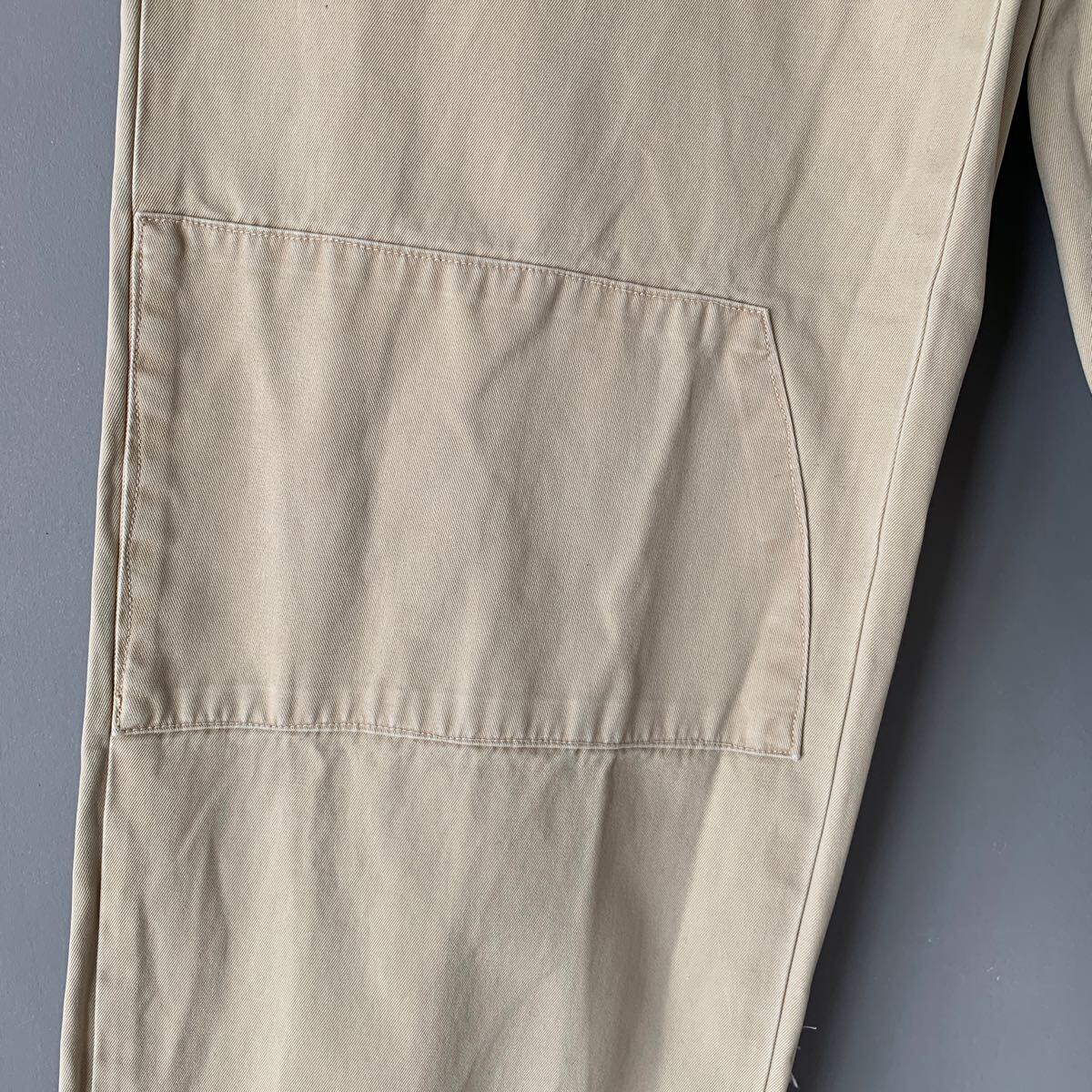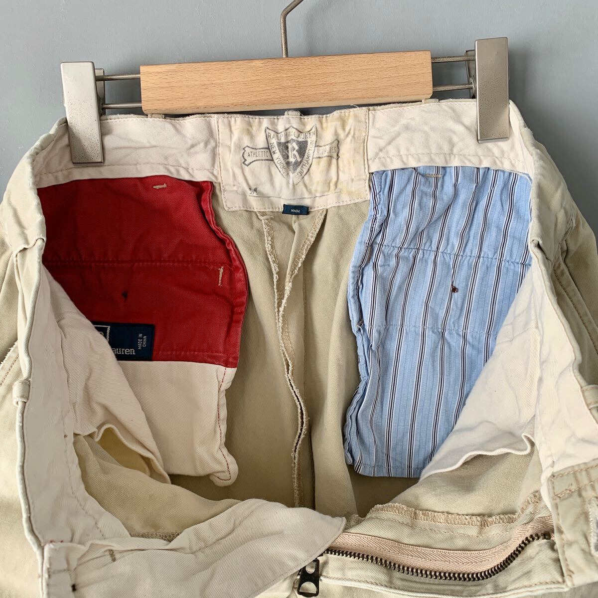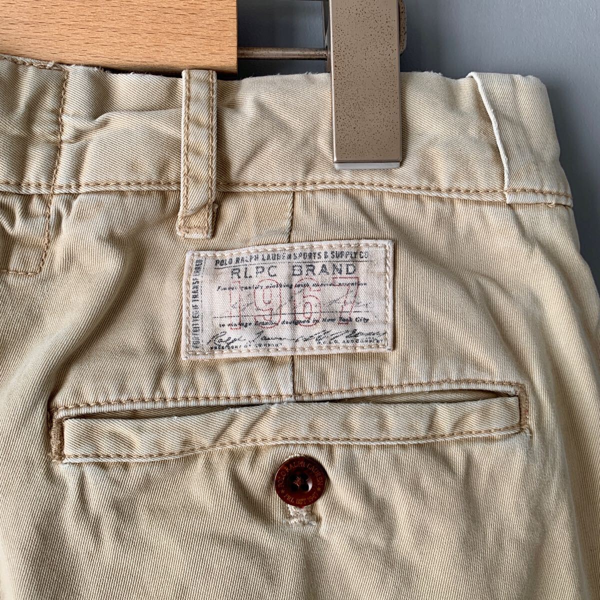 ラルフローレンのチノパンツです。ベーシックなトラウザータイプのチノに、膝に大きくリペア1箇所、小さいリペア2箇所、バックポケット袋の生地張り替えなど、程よいさじ加減のリアルなカスタムがほどこされています。(新品からのものです)