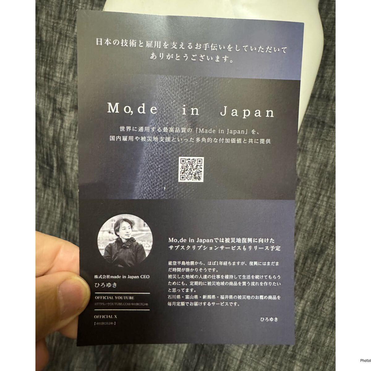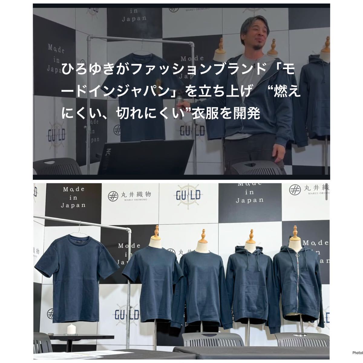 ひろゆきと共同でmade in Japanを設立する丸井織物は、石川県で日本最大の織物工場を展開する、繊維の産地企業としては最大かつ名門中の名門企業の一つ。「モードインジャパン」でもそうした技術をフル活用し、扱いの難しいアラミド繊維を100%使ったパーカの開発にこぎつけた。丸井織物の宮本智之・代表取締役専務は、「made in Japanは(丸井織物の本社のある)石川県の中能登町に置いた。ひろゆきさんと組んで、繊維に限らず、日本中の優れた技術を発掘したい」と語った。