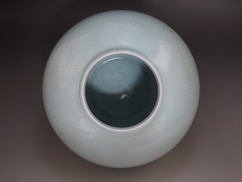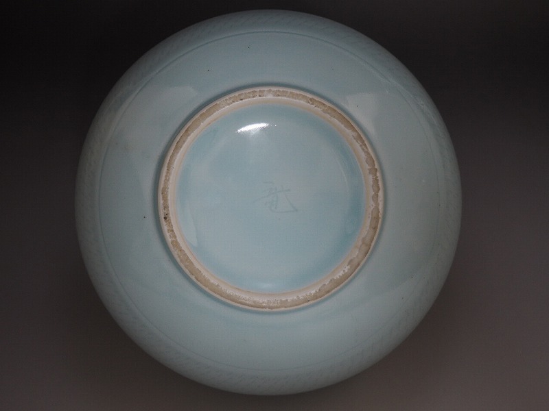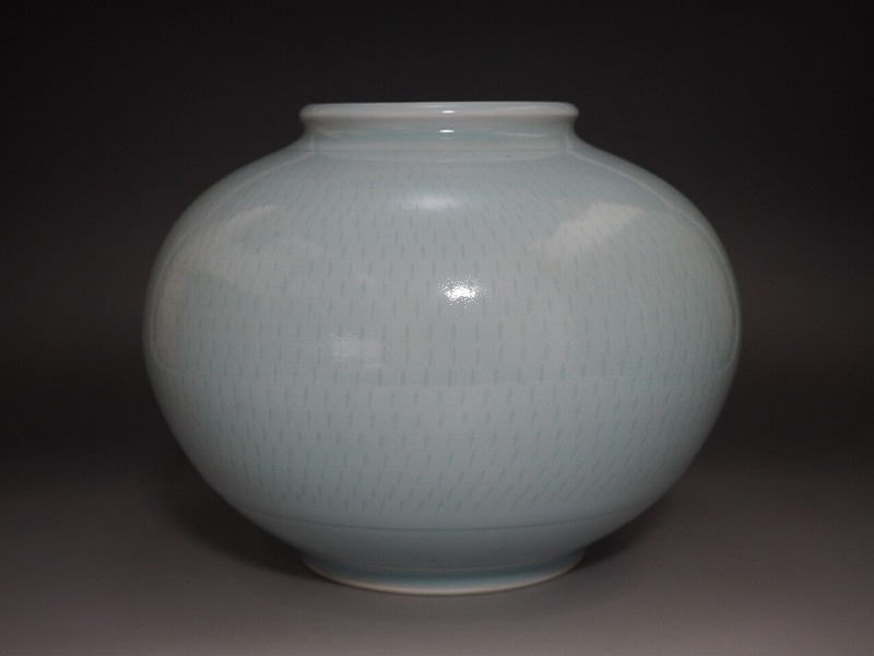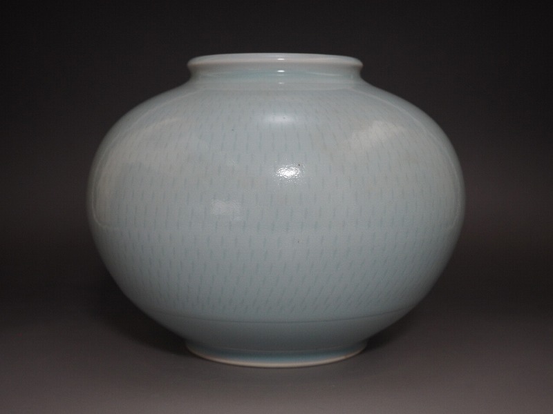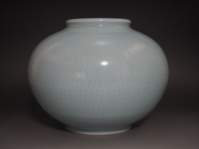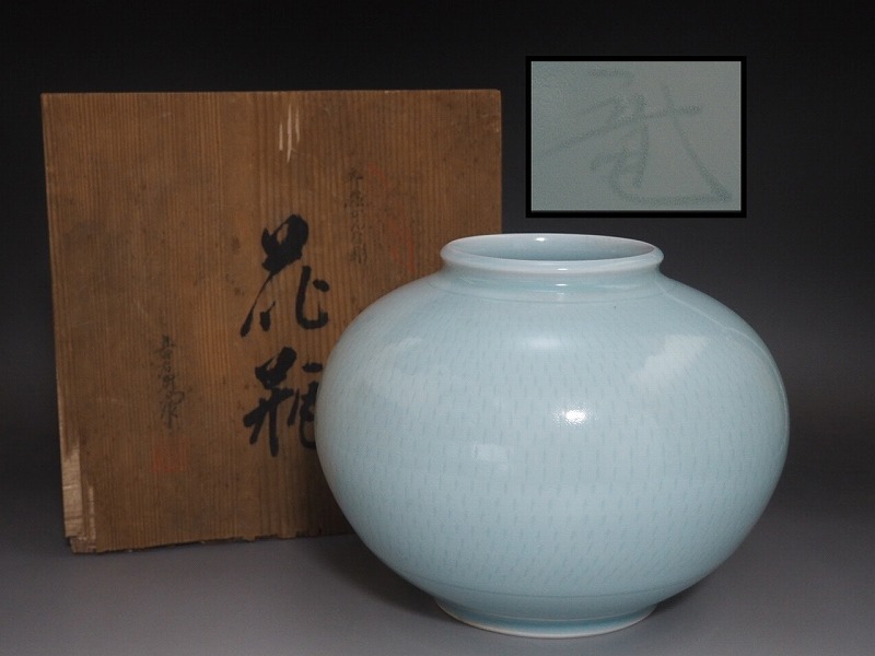 | D0106 竜右衛門 作 青瓷 かんな彫 花瓶 共箱付 ☆ 華道具 花道具 茶道具 花器 花入 花生 飾壺 飾壷 磁器 作家物 在銘 陶印 美品 良品 無傷 | ||