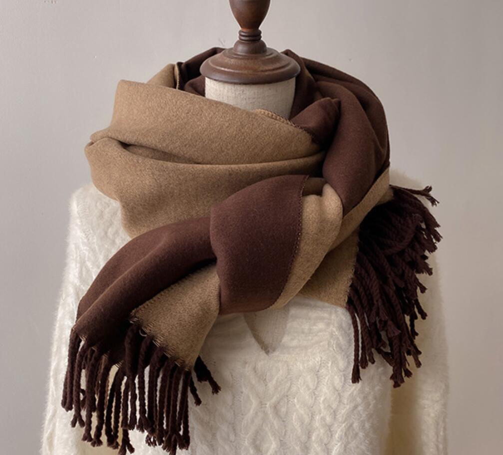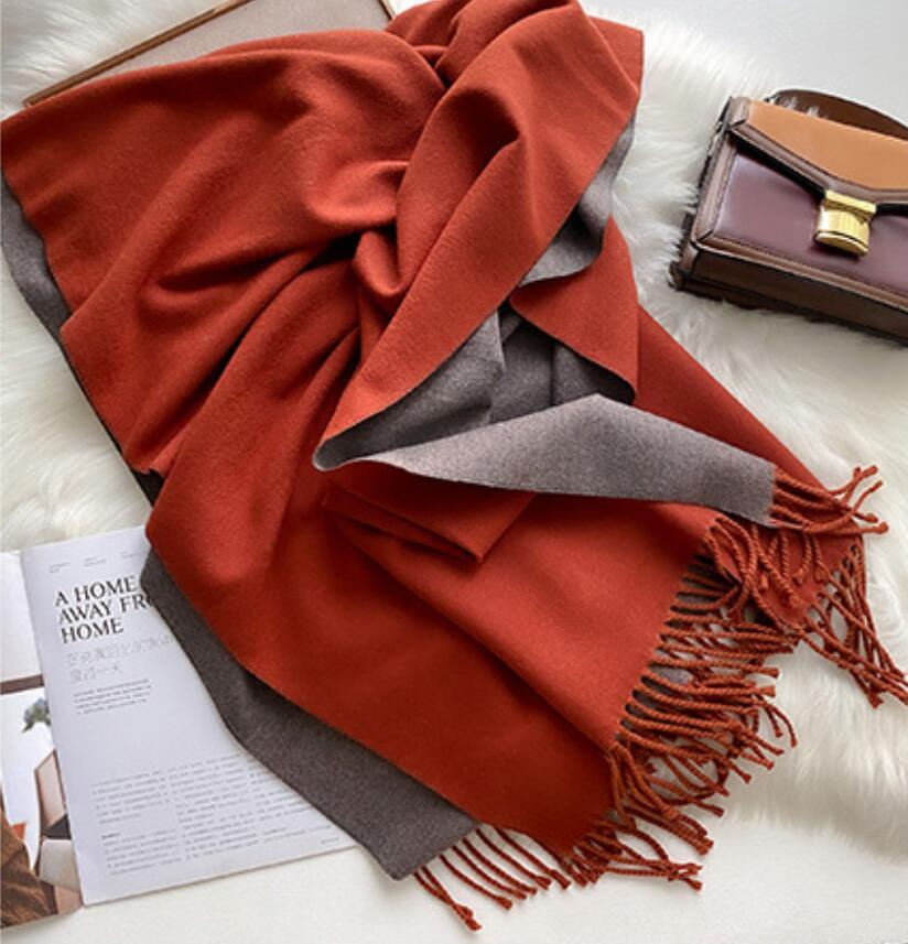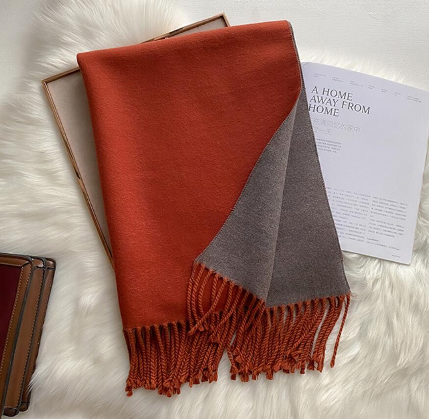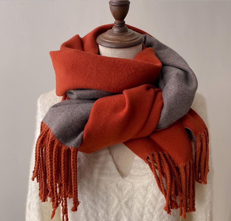 秋冬新作~上品 大判 マルチチェック ボリュームフリンジマフラー 暖かい 厚手 大人 きれいめ 配色 オシャレ~ オレンジ&紫