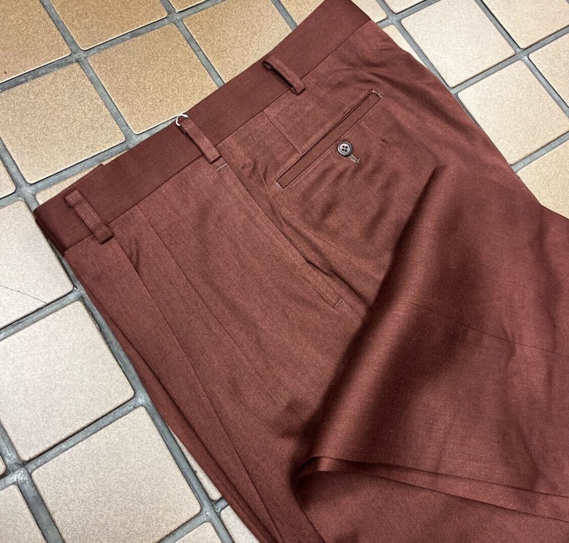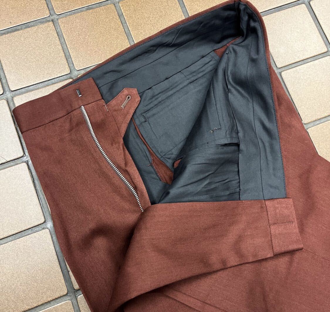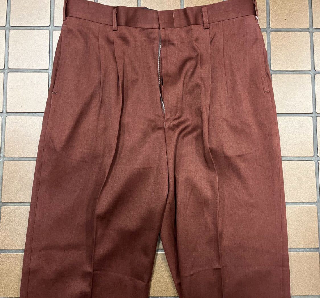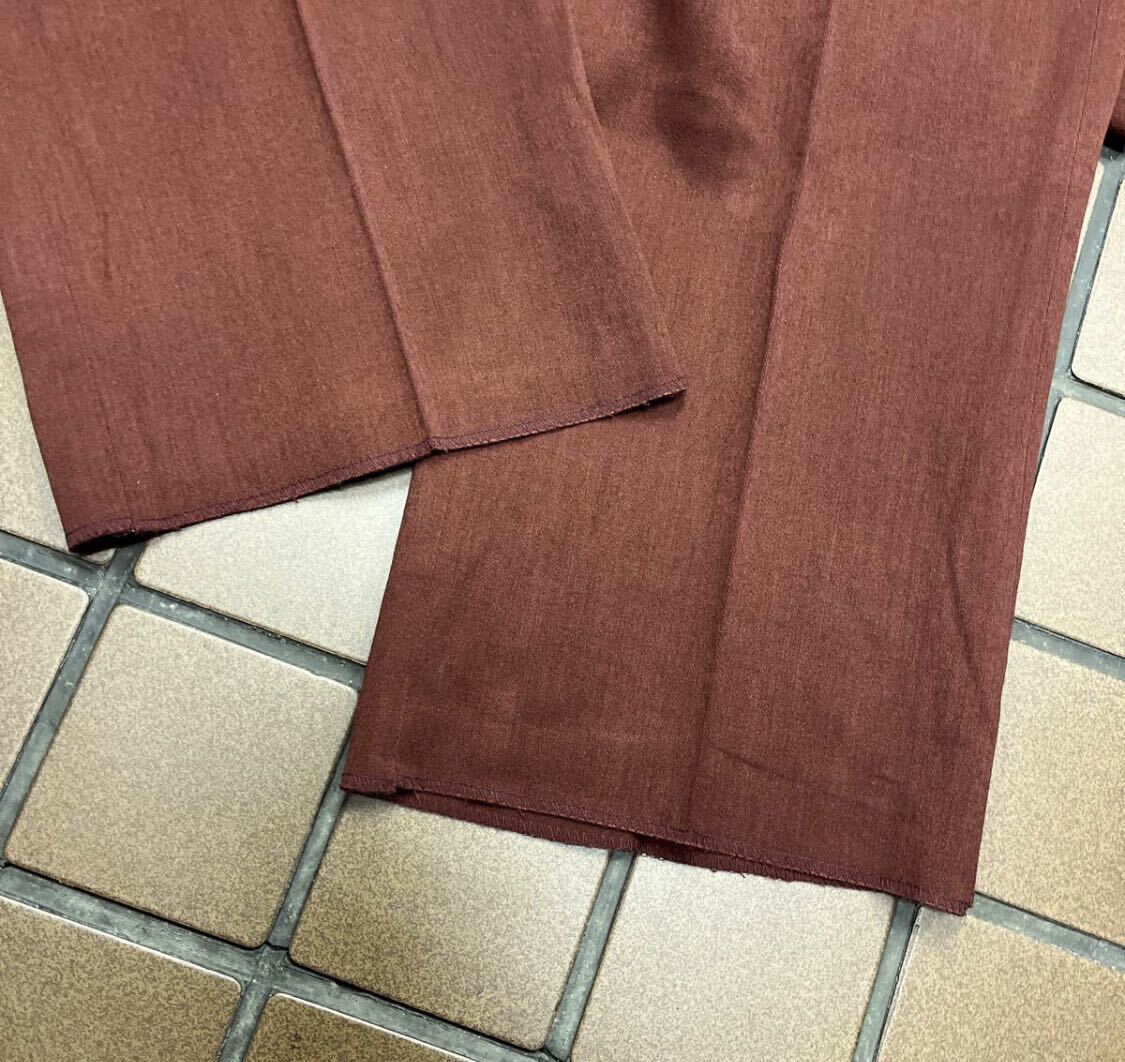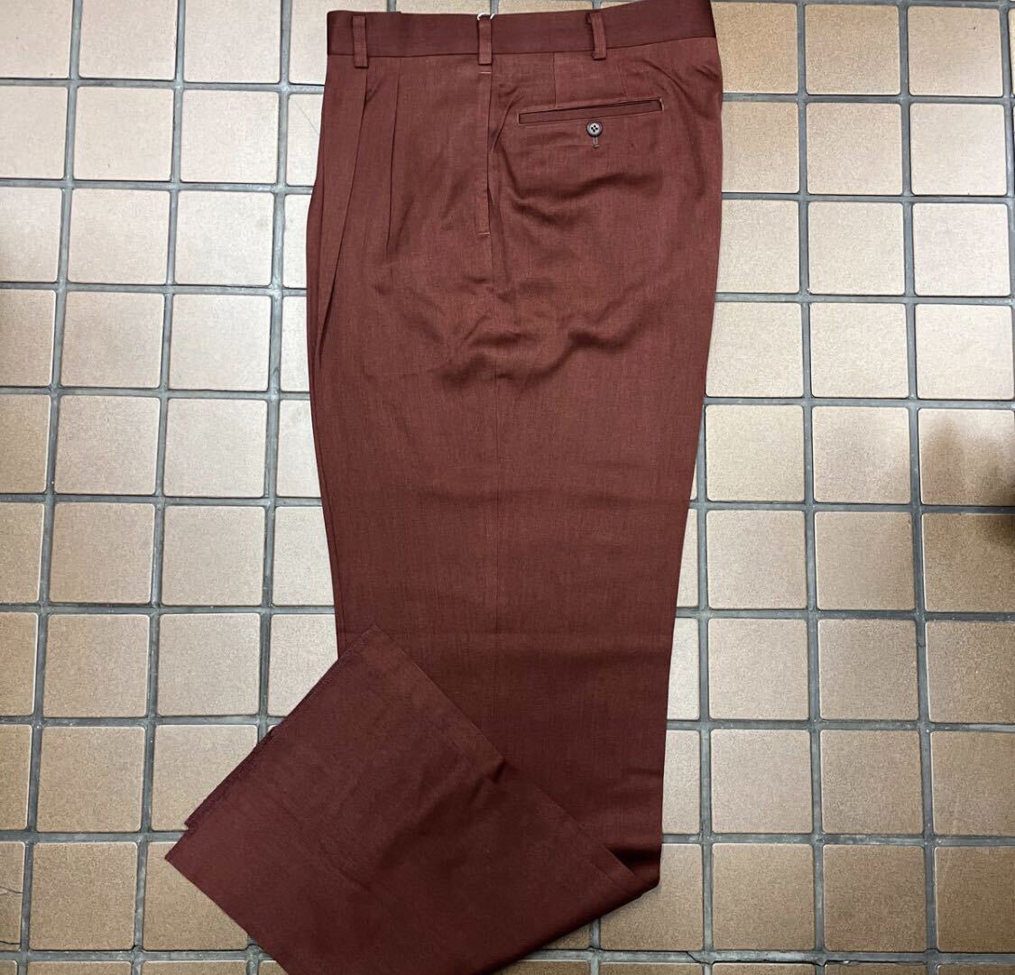 ゆったりと履ける動きやすいスラックスパンツ。ゴルフなどに着用しても大活躍。お色はワインレッドに近い色味で艶があり、とてもきれいです。オールシーズン着用出来ます。この機会に是非ご体験くださいませ。
