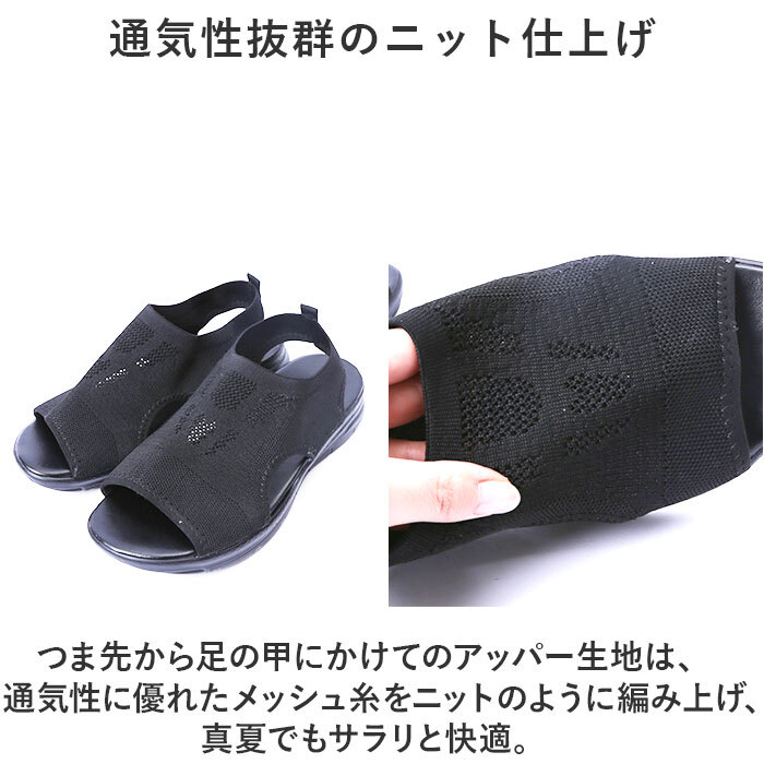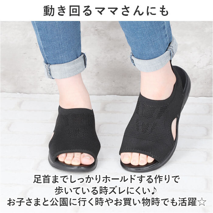 | 商品説明 | ・・ふわっと軽いレディースサンダルが新発売♪ ・【通気性抜群のニット仕上げ】 ・つま先から足の甲にかけてのアッパー生地は、通気性に優れたメッシュ糸をニットのように編み上げ、真夏でもサラリと快適。 ・【ふわっと軽快な履き心地】 ・足をすっぽりと包み込むしっかりとしたフォルムと、片足約106gの軽さを両立。履いていることを忘れてしまうほどの軽い履き心地で、軽快なフットワークを実現。(※37(23.5cm)サイズ片足分の重量です。) ・【動き回るママさんにも】 ・足首までしっかりホールドする作りで歩いている時ズレにくい♪お子さまと公園に行く時やお買い物時でも活躍☆ ・【滑りにくいアウトソール】 ・溝を刻んだアウトソールが、雨に濡れた路面もしっかりとグリップ。 ・【脱ぎ履きスムーズに】 ・プルトップ付きなので着脱のしやすさがバツグン。お出かけ先でも脱ぎ履きがスムーズ◎ |