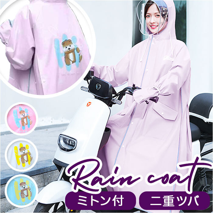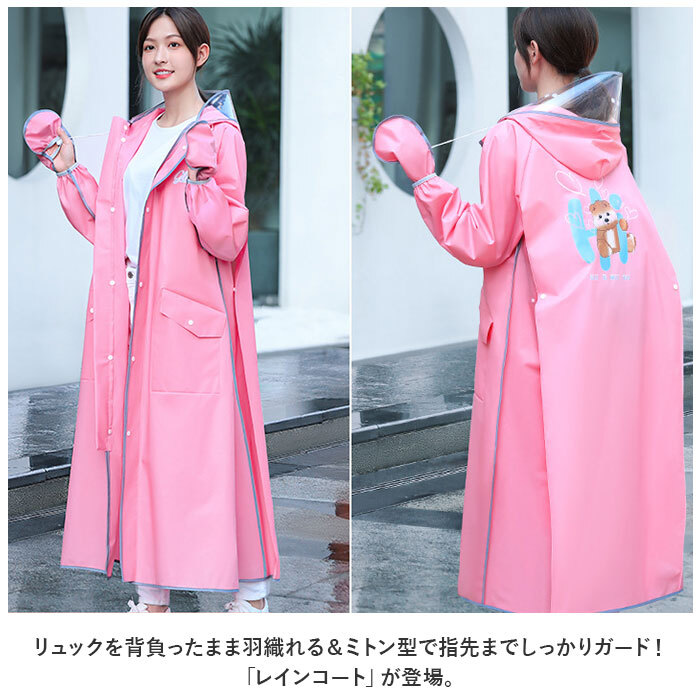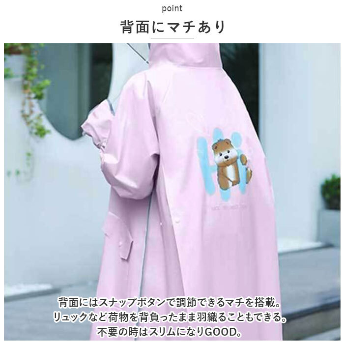 | 商品説明 | ・・リュックを背負ったまま羽織れる&ミトン型で指先までしっかりガード!「レインコート」が登場。 ・【ゆったりロング丈】 ・フロントはファスナー&スナップボタン。身幅ゆったりのロング丈で、雨から全身をしっかりガード! ・【背面にマチあり】 ・背面にはスナップボタンで調節できるマチを搭載。リュックなど荷物を背負ったまま羽織ることもできる。不要の時はスリムになりGOOD。 ・【ミトンつき】 ・指先までガードできるミトン型の雨除けつき。ゴムバンドに手を通すだけなので、付け外しも楽々。手首もゴム仕様なので、雨が入り込みにくい。 ・【ポケットつき】 ・大きめのポケットが2つ!スナップボタンを閉めて雨除けできるので、鍵などの小物の収納に便利。 ・【2重ツバつき】 ・付属の2重構造のツバを着ければ、顔やヘアスタイルを雨風からしっかりガードできる!スナップボタンで簡単装着できるのも嬉しいポイント。 ・【ピカッと光るリフレクター付き】 ・フード部分にはピカッと光るリフレクター素材が付いているので、すれ違う車から認識されやすくなり、薄暗い雨の日でも安心♪ ・【かわいいデザイン】 ・背面には可愛いキャラクターのデザイン☆さりげない可愛さで、雨の日のお出かけを楽しく♪ ・【選べるカラー】 ・大人可愛いカラーのラインナップ。お好みのカラーをチョイス☆ |