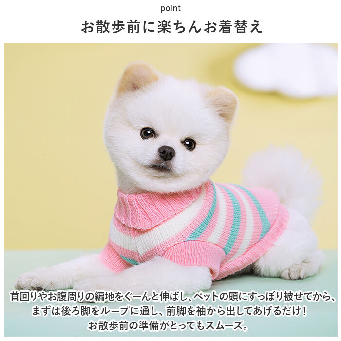 | 商品説明 | ・・飼い主さんとのお出掛けは、カラフルニットで秋冬コーデ!鮮やかな色合いがパッと目を惹く「ペット用ニット」が新登場。 ・【ふんわり着せて、優しく防寒】 ・細めの毛糸をざっくりと編みこんで仕上げた、ワンちゃん・ネコちゃんも着用できるシンプルニット。厚すぎず薄すぎない、肌寒い季節にサッと着せてあげられる程よい厚みの生地感がポイント! ・【お散歩前に楽ちんお着替え】 ・首回りやお腹周りの編地をぐーんと伸ばし、ペットの頭にすっぽり被せてから、まずは後ろ脚をループに通し、前脚を袖から出してあげるだけ!お散歩前の準備がとってもスムーズ。 ・【ピタッと可愛いシルエットに】 ・首回りや袖口、ウェアの裾は伸縮性のあるリブ生地で仕上げてあるため、ワンちゃんの身体のラインにぴったりフィット。スキマ風をシャットアウトして、毛糸が包みこんだ暖かな空気をキープ。 ・【おトイレ楽ちん・ゆったり設計】 ・ワンちゃんがおトイレする時にもたつかない♪お腹周りやお尻が大きく開いたゆったりデザイン。 ・【超小型~小型犬にぴったり】 ・SサイズからXXLサイズまでの5つのサイズから、ぴったりサイズがチョイス可能!超小型犬から、胴回り40cm程度までの中小型犬に最適なサイズ感。小さなサイズはネコちゃんにもオススメ。 ・【ご家庭で簡単お洗濯♪】 ・セーターやニットのように、オシャレ着用洗剤で優しく手洗いすれば、ご家庭でお洗濯が可能!こまめにお手入れしていつでも清潔。(※必ず手洗いでお手入れしてください。ドライクリーニングはご利用いただけません。) ・【飼い主さんとリンクコーデ】 ・毛糸の鮮やかなコントラストに、ハートやボーダーの編み柄が華やかに浮かびあがるオシャレなカラーバリエーション。飼い主さんのニットやセーターに合わせてコーディネートしても楽しい♪ ・【ルームウェアにも◎】 ・肌寒さが気になる季節のお散歩用ウェアとしてはもちろん、ルームウェアやパジャマとして、朝晩の冷え込み対策にもオススメ。 |