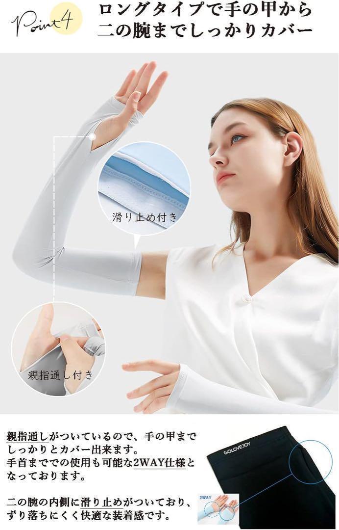 親指通し が付いているので、 二の腕 から 手の甲 までしっかりと カバー 出来ます。 手首 まででの使用も可能な 2WAY 仕様となっております。二の腕の内側に 滑り止め が付いており、 ずり落ちにくく 快適 な 装着感 です。