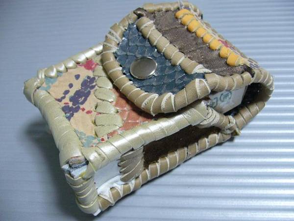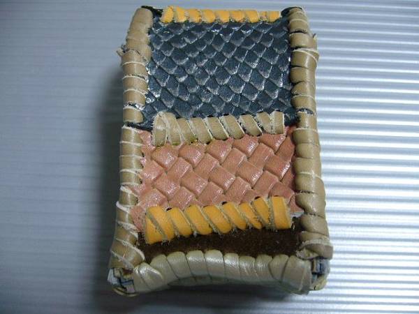 表面の蓋から後ろ側にかけては、鱗の柄を型押しをしたダークブルーのレザー、ステッチを入れたような型押しのゴールドレザー、ペイントしたようなデザインのレザー、赤みのあるオレンジレザーとレザーに、線状でペイントしたようなデザインのレザー、ブラウンスエードレザーをカーキの革ひもとイエローの入ったオレンジカラーの革ひもで、かがってつなぎました。