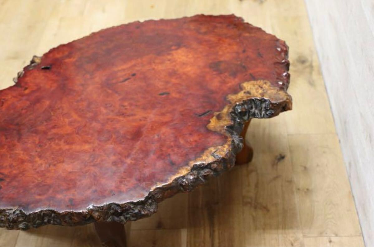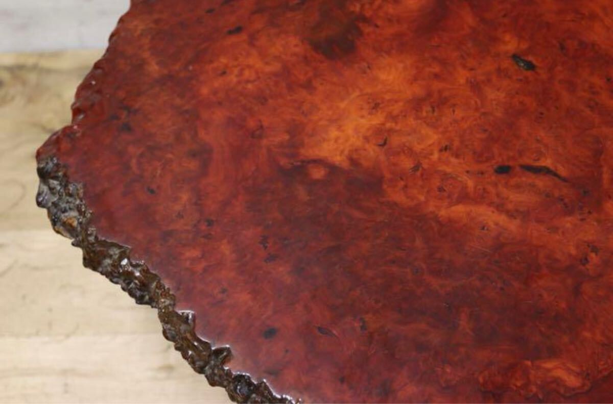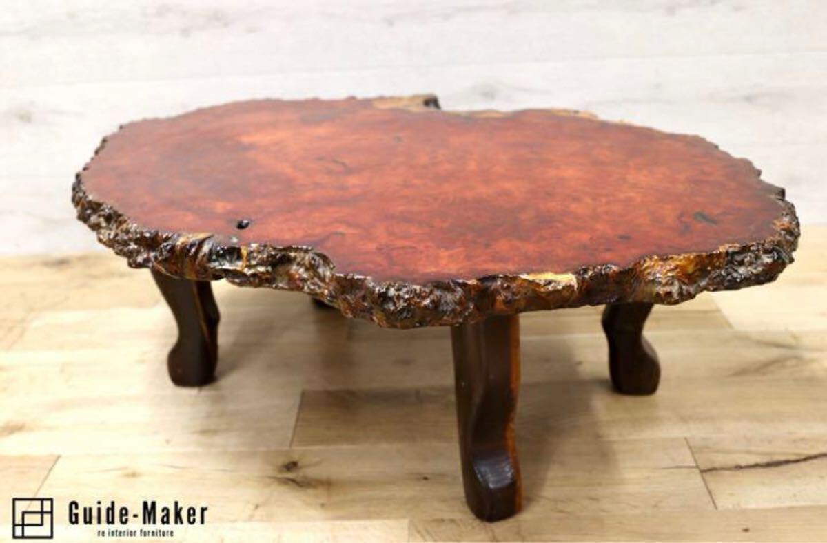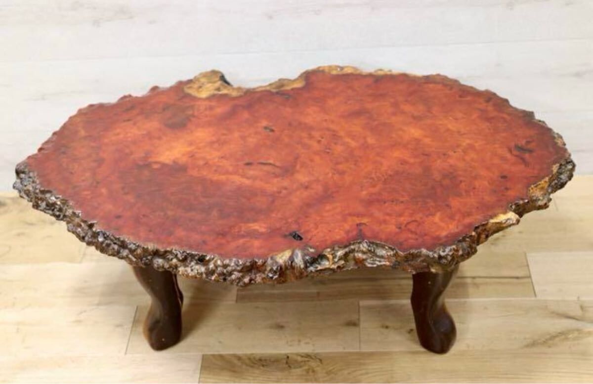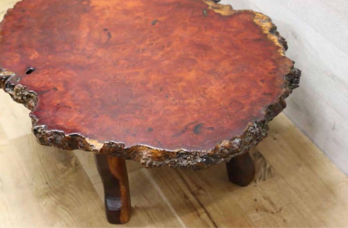 高級材である花梨の一枚板を使用した小降りなローテーブルです。天板には鳥眼杢が広がっており、縁にはごつごつとした自然樹皮の表情が独特の存在感を発揮しています。