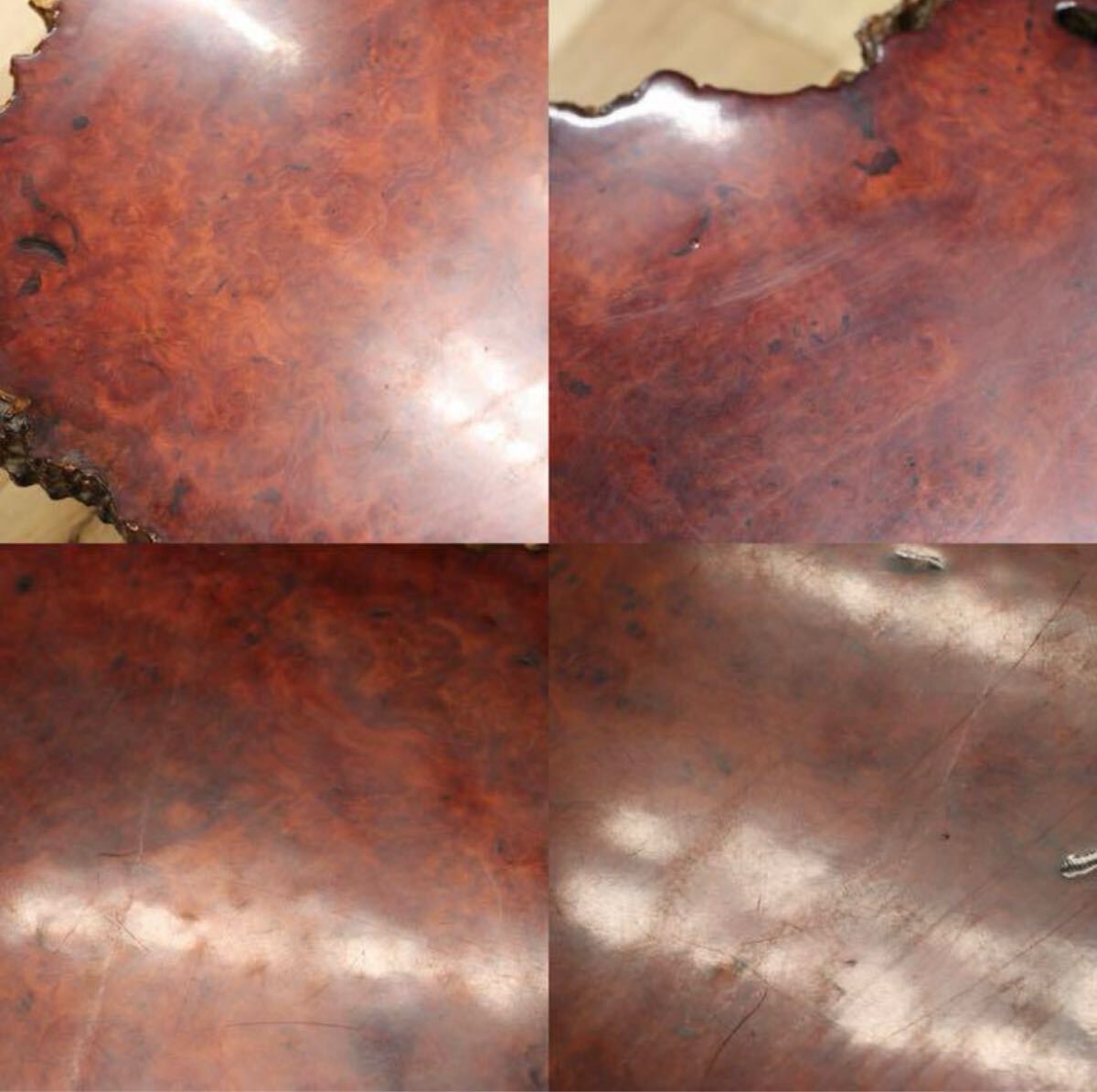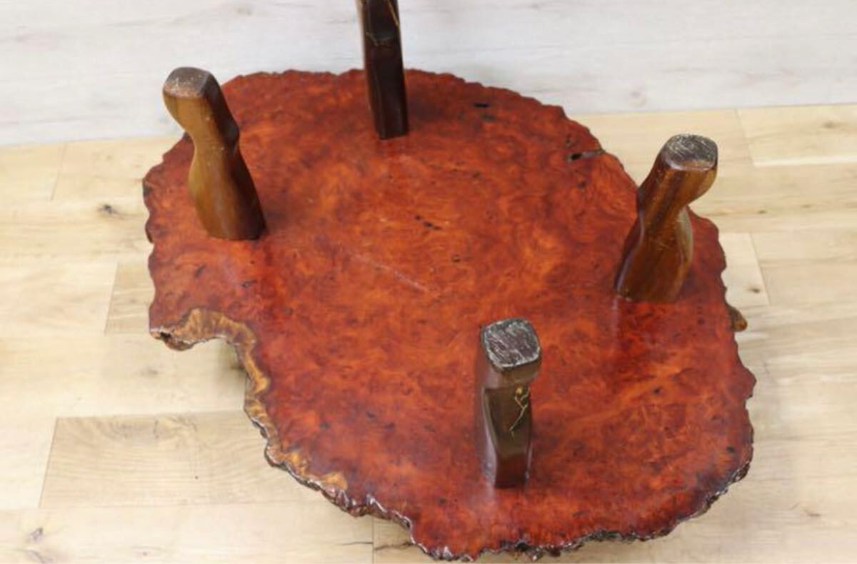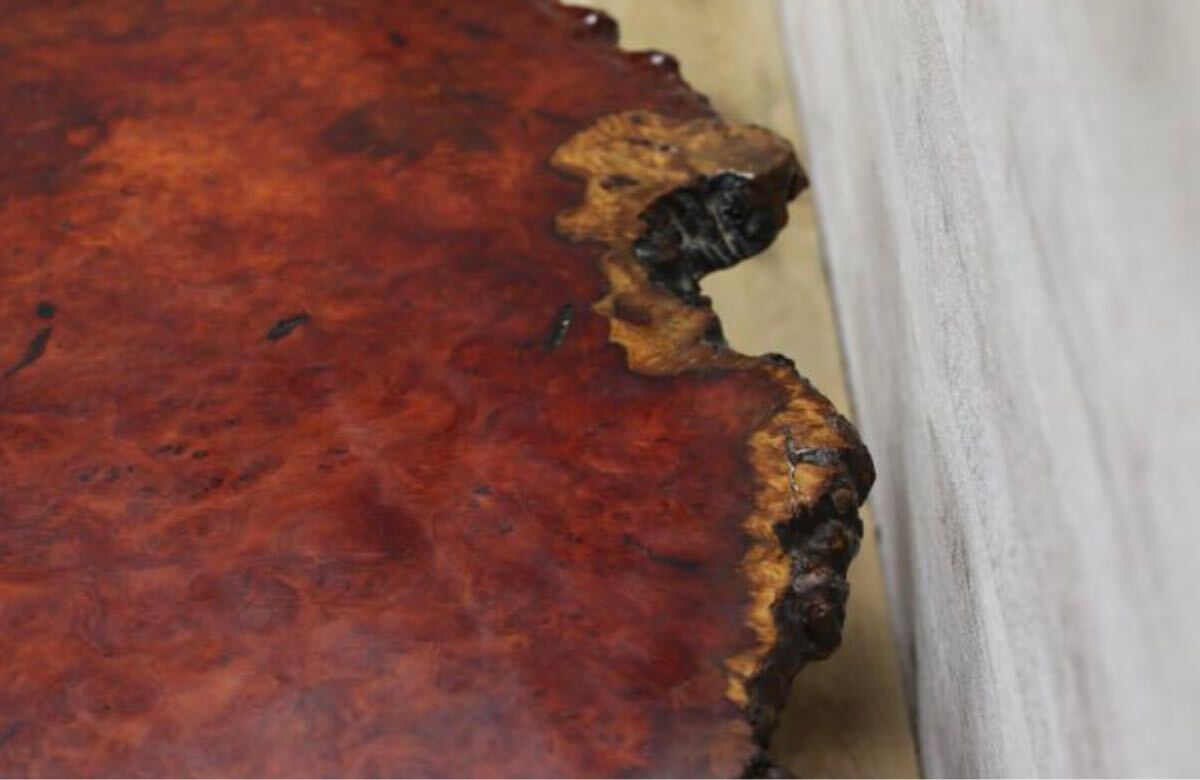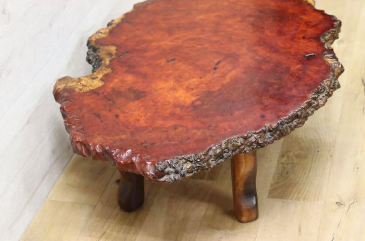 高級材である花梨の一枚板を使用した小降りなローテーブルです。天板には鳥眼杢が広がっており、縁にはごつごつとした自然樹皮の表情が独特の存在感を発揮しています。