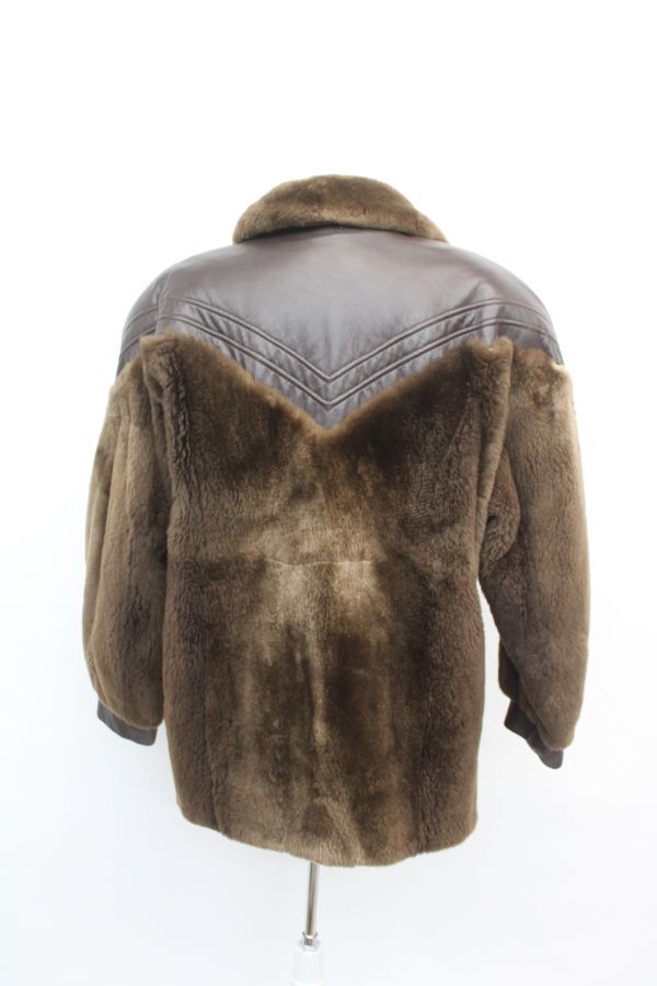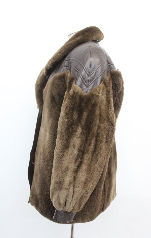 ブラウン・シェアード・ラクーン毛皮ファー&ブラウン・レザー・ジャケット。柔かな毛並み。ウィングカラー。スナップボタン留め。ブレスレット・カフス。
