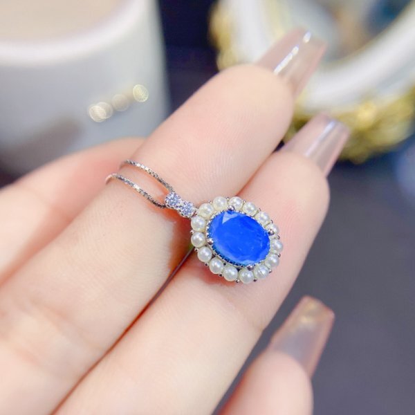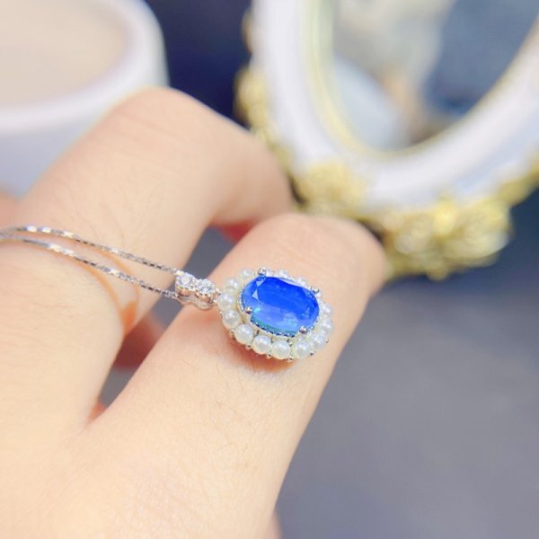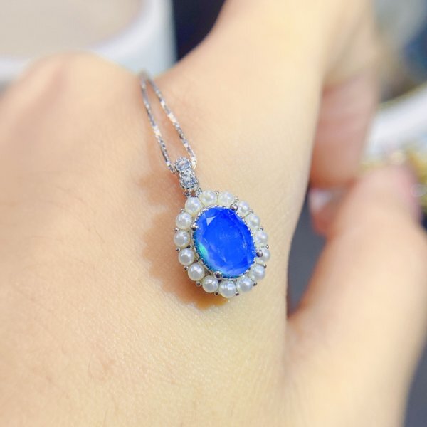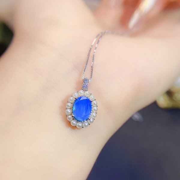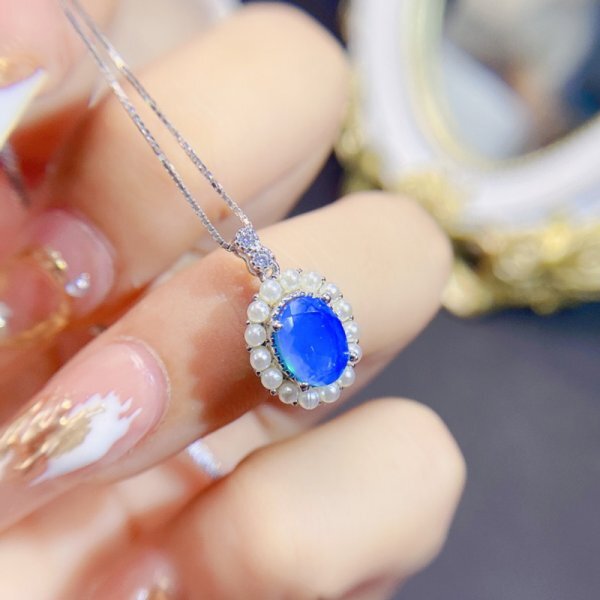 女性用ナチュラルブルーオパールネックレス、925シルバー、18Kゴールドメッキ