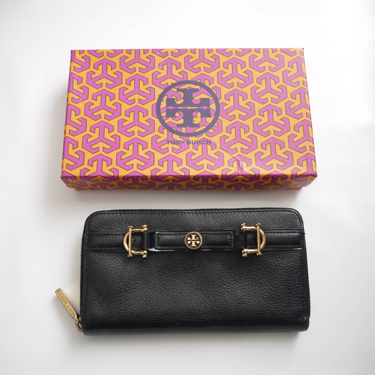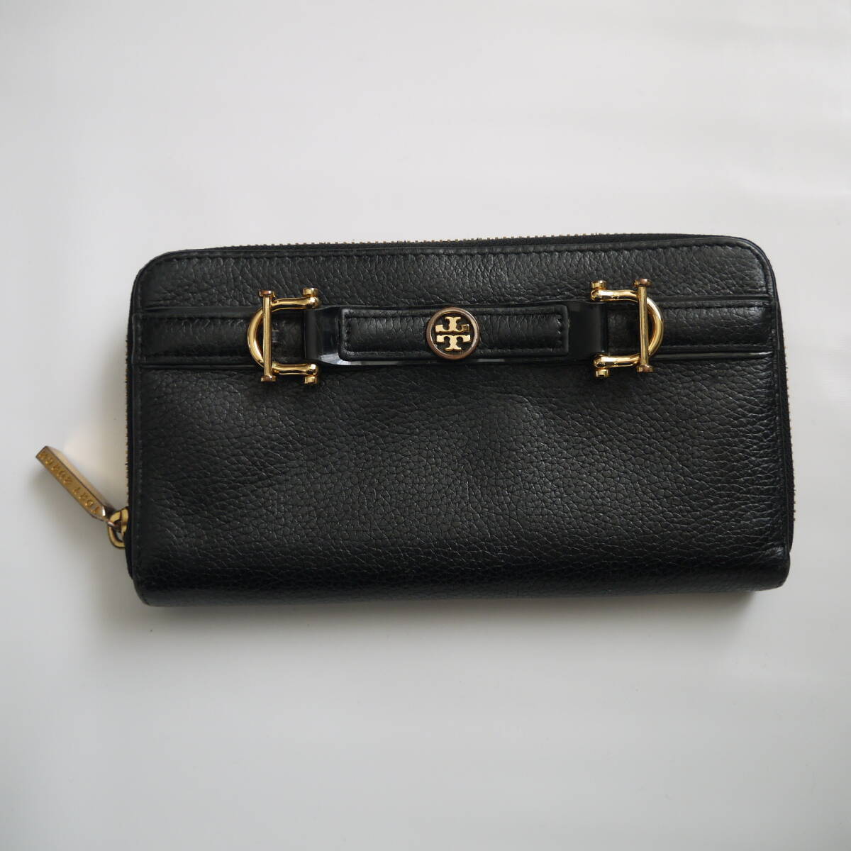 ◇  激レア デザイン!           トリーバーチ の    ブラック系  ラム革 レザー素材に    ベルトデザインと  ゴールド色の金具や  TORY BURCH  ロゴプレートが お洒落な♪      トリーバーチ  ラウンドファスナー 長財布・ウォレット に成ります。