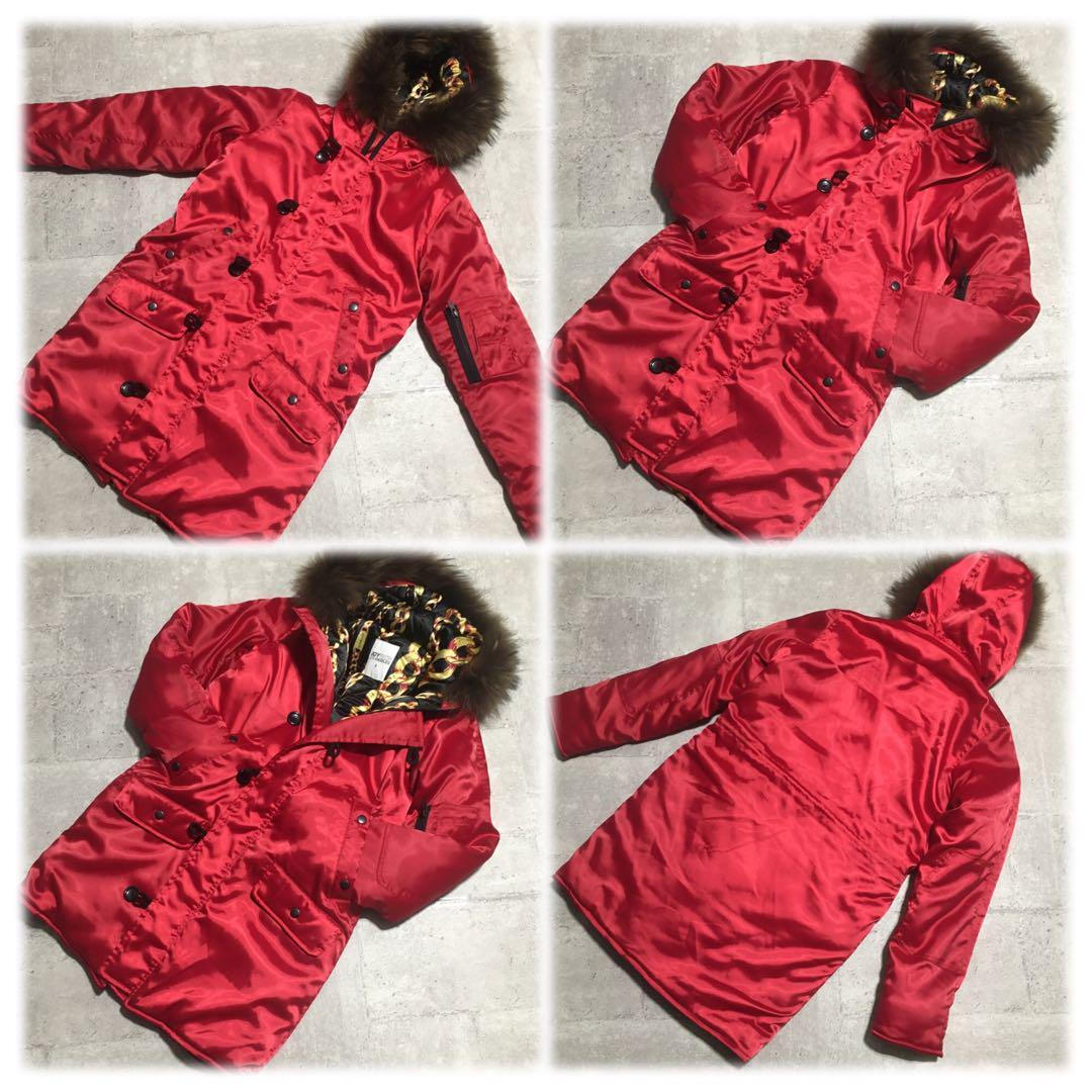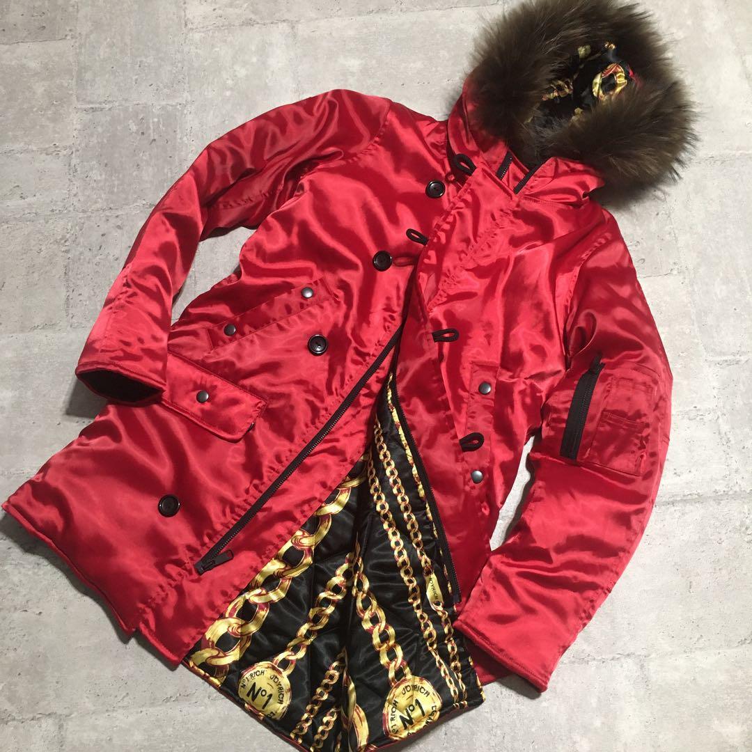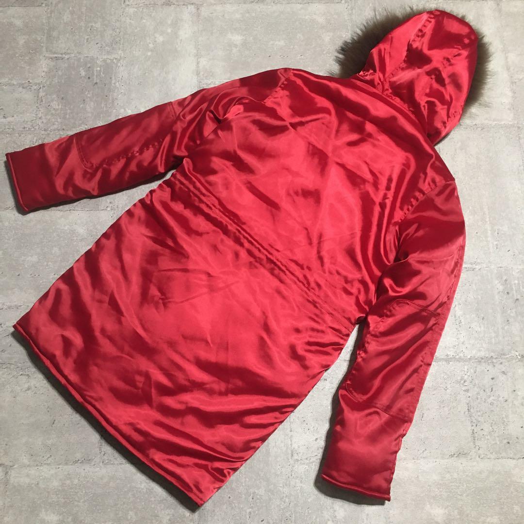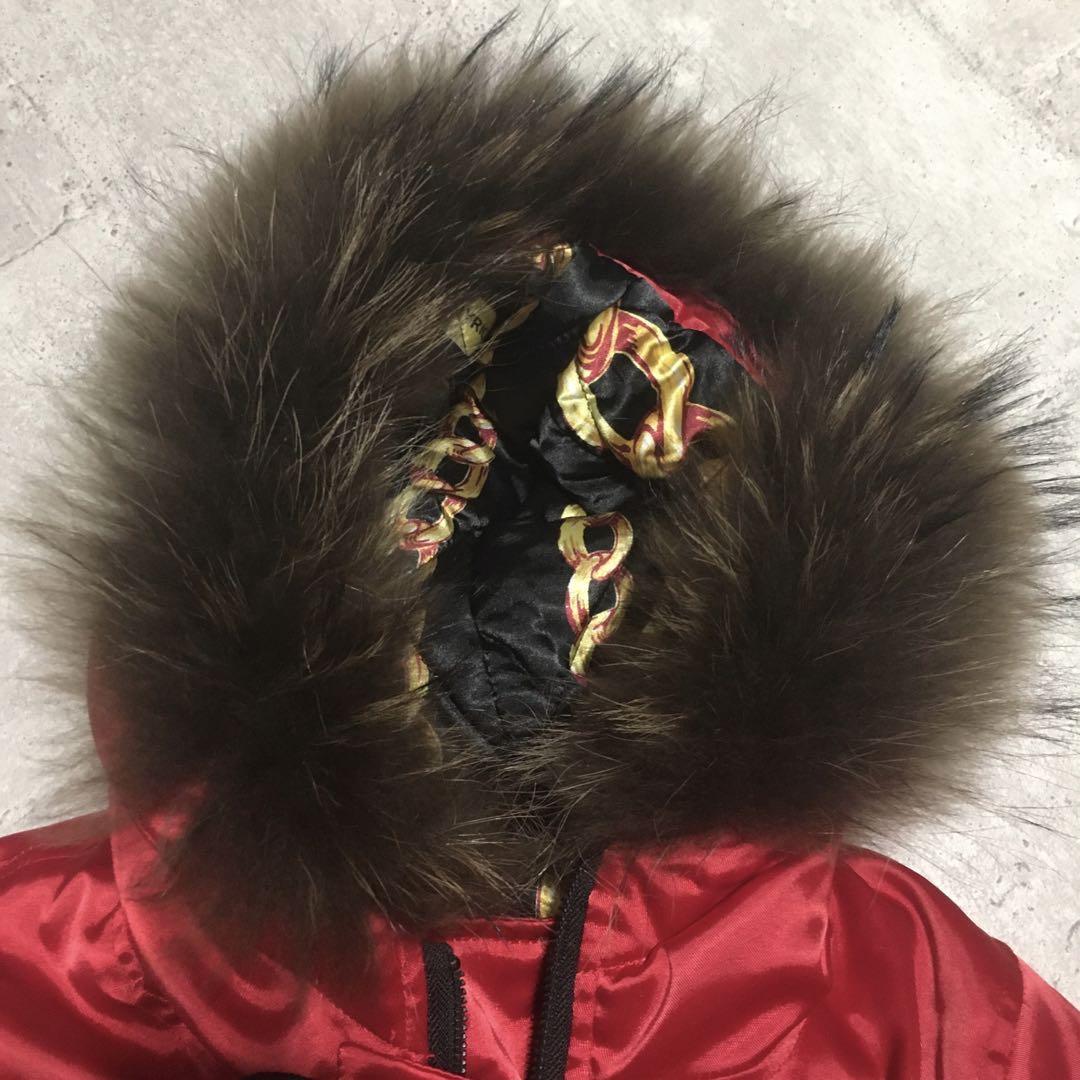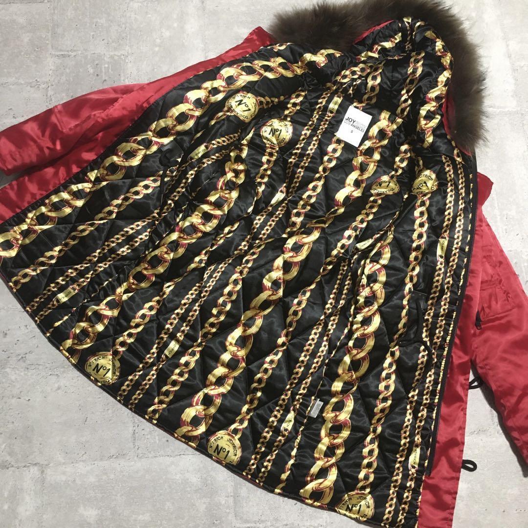 表地の赤も光沢があってリアルファーも映えますが、裏地が特に目立ちます。