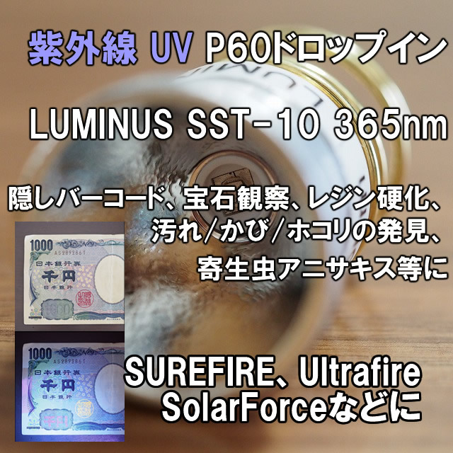| 商品の詳細 | 性能、耐久性共に非常に高い評価を受ける紫外線UV LED、LUMINUS SST-10-UV 365nm LEDを搭載したP60規格のドロップインモジュール |