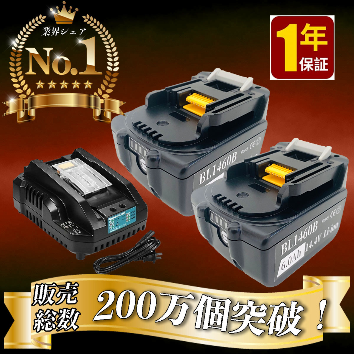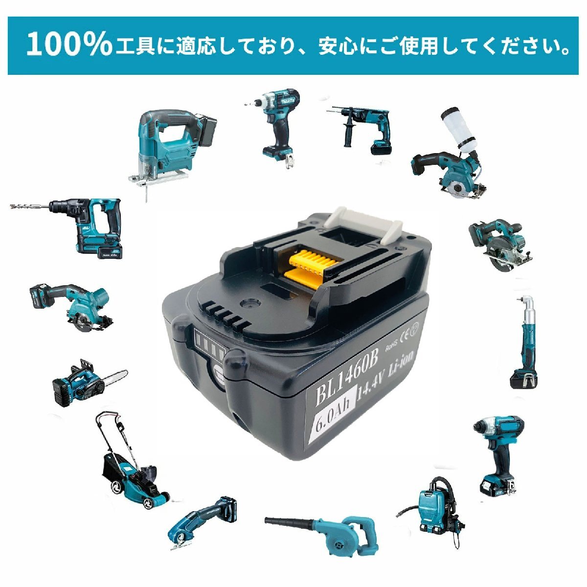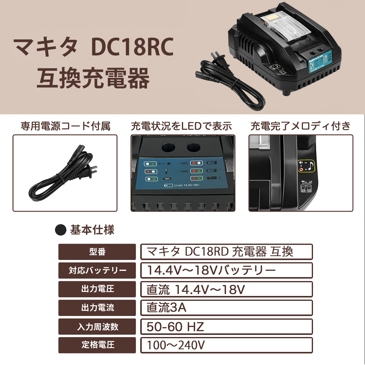 おかげさまで、シリーズ累計200万個販売突破☆【BL1460B】マキタ互換バッテリーを高品質、高性能、低コストで実現!大容量6.0Ah!残量表示機能付き!確認ボタンを押したら、4段階の残量が見えます !過充電、過放電の防止システム搭載!■商品スペック・充電式リチウムイオンバッテリーパック・14.4V 6000mAh 108Wh・PSEマーク取得商品■交換可能バッテリーBL1415N BL1420B BL1430B BL1430B BL1440B BL1450B BL1460B 194065-3 194066-1 などに対応。対応充電器: DC18RA DC18RC DC18RD DC18RFなどの充電器にサポート出来ます。■BL1460B 適合工具シリーズ【ピンカッタ】:PT350D 【ジグソー】:JV140D【小型集じん機】:VC340D 【ブロア】:UB142D【アングルドリル】:DA340D 【ハンマドリル】:HR162D【インパクトレンチ】:TW152D 【チェンソー】:UC121D【ドライバドリル】:DF445D 【生垣バリカン】:MUH351D【コンクリートバイブレータ】:VR340D・VR440D 【マルノコ】:SS540D【スクリュードライバー】:FS440D・FR440D 【4モードインパクトドライバ】:TP130D 【タッカ】:ST110D・ST420D・ST120D【インパクトドライバ】:TD134D・TD136・TD133D・TD132D・TD131D・TD135D【DC18RCmini】マキタ 充電器 互換品 DC18RC 18V 14.4V対応入力:110~220V 50/60Hz 出力:14.4-18V 3Amakita充電器 幅広い互換性■本製品の信頼電気用品安全法に基づくPSEマーク取得済み商品となります。■輸入元株式会社成洋【商品仕様】マキタ 充電器 互換品 DC18RC 18V 14.4V対応入力:110~220V 50/60Hz 出力:14.4-18V 3Aマキタ18v:BL1815 BL1830 BL1840 BL1850 BL1860対応マキタ14.4v:BL1415 BL1430 BL1440 BL1450 BL1460対応【バッテリーの充電方法】充電器の電源プラグを100Vの電源コンセントに差し込んでください。充電表示ライトは「緑」の点滅を繰り返します。 バッテリーを急速充電器の挿入ガイドにそって、一番奥まで入れでください。充電器の端子カバーはバッテリ挿入に伴い開閉します。 バッテリーを挿入しますと充電表示ライトが「赤」に点灯し、現在設定されている充電完了メロディーの確認音が短時間鳴り、充電を開始ます。充電が完了すると「緑」の点灯に変わり、充電完了メロディーや電子ブザー音が鳴ります。 そのままバッテリを挿入しておけば、バッテリーを冷却しながらトリクル充電を24時間行います。 充電時間は周囲温度(10℃-40℃)やバッテリーの状態(新品・長期保存バッテリーや寿命に近いバッテリー等)により変動します。 充電完了後すぐに使用しない場合は、バッテリーの冷却を行いますので、そのまま差し込んでおくことをおすすめします。■保証についてご購入日から1年の間、製品に不具合が生じた場合は、新品に交換対応を致します。ご購入日より1週間以内の初期不良の場合、着払いにてご返送いただけます。※水没・破損・加工・分解の形跡・外観に大きな損傷・過酷な使用状態と思われるものは、保証対象外となりますので、ご返送いただいてからの保証対応となります。