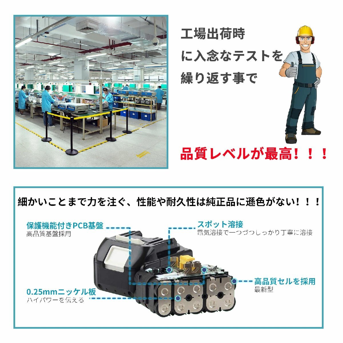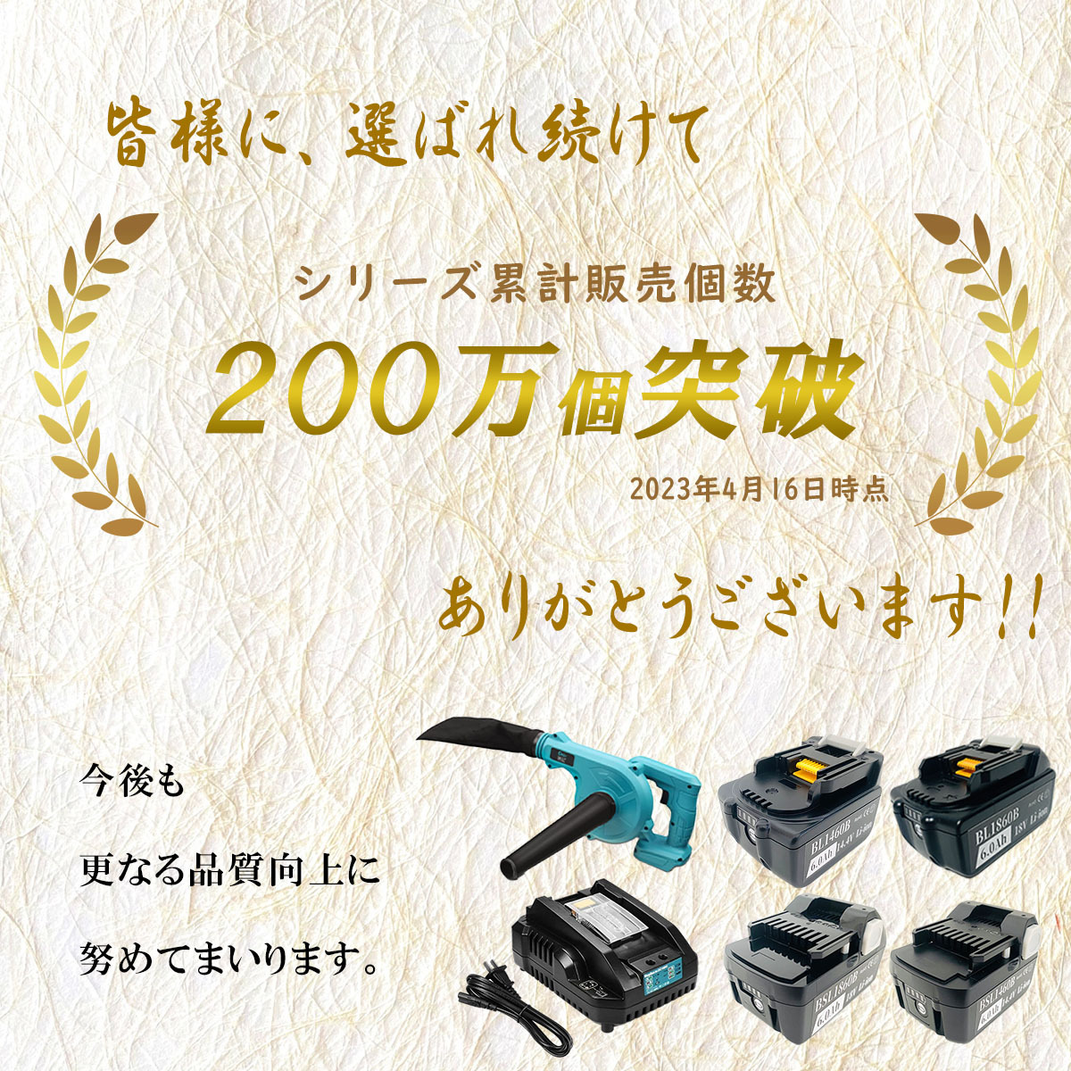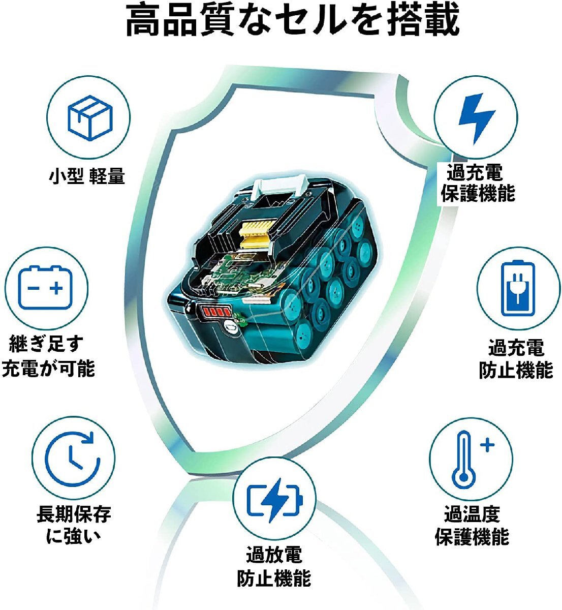 おかげさまで、シリーズ累計200万個販売突破☆【BL1460B】マキタ互換バッテリーを高品質、高性能、低コストで実現!大容量6.0Ah!残量表示機能付き!確認ボタンを押したら、4段階の残量が見えます !過充電、過放電の防止システム搭載!■商品スペック・充電式リチウムイオンバッテリーパック・14.4V 6000mAh 108Wh・PSEマーク取得商品■交換可能バッテリーBL1415N BL1420B BL1430B BL1430B BL1440B BL1450B BL1460B 194065-3 194066-1 などに対応。対応充電器: DC18RA DC18RC DC18RD DC18RFなどの充電器にサポート出来ます。■BL1460B 適合工具シリーズ【ピンカッタ】:PT350D 【ジグソー】:JV140D【小型集じん機】:VC340D 【ブロア】:UB142D【アングルドリル】:DA340D 【ハンマドリル】:HR162D【インパクトレンチ】:TW152D 【チェンソー】:UC121D【ドライバドリル】:DF445D 【生垣バリカン】:MUH351D【コンクリートバイブレータ】:VR340D・VR440D 【マルノコ】:SS540D【スクリュードライバー】:FS440D・FR440D 【4モードインパクトドライバ】:TP130D 【タッカ】:ST110D・ST420D・ST120D【インパクトドライバ】:TD134D・TD136・TD133D・TD132D・TD131D・TD135D【DC18RCmini】マキタ 充電器 互換品 DC18RC 18V 14.4V対応入力:110~220V 50/60Hz 出力:14.4-18V 3Amakita充電器 幅広い互換性■本製品の信頼電気用品安全法に基づくPSEマーク取得済み商品となります。■輸入元株式会社成洋【商品仕様】マキタ 充電器 互換品 DC18RC 18V 14.4V対応入力:110~220V 50/60Hz 出力:14.4-18V 3Aマキタ18v:BL1815 BL1830 BL1840 BL1850 BL1860対応マキタ14.4v:BL1415 BL1430 BL1440 BL1450 BL1460対応【バッテリーの充電方法】充電器の電源プラグを100Vの電源コンセントに差し込んでください。充電表示ライトは「緑」の点滅を繰り返します。 バッテリーを急速充電器の挿入ガイドにそって、一番奥まで入れでください。充電器の端子カバーはバッテリ挿入に伴い開閉します。 バッテリーを挿入しますと充電表示ライトが「赤」に点灯し、現在設定されている充電完了メロディーの確認音が短時間鳴り、充電を開始ます。充電が完了すると「緑」の点灯に変わり、充電完了メロディーや電子ブザー音が鳴ります。 そのままバッテリを挿入しておけば、バッテリーを冷却しながらトリクル充電を24時間行います。 充電時間は周囲温度(10℃-40℃)やバッテリーの状態(新品・長期保存バッテリーや寿命に近いバッテリー等)により変動します。 充電完了後すぐに使用しない場合は、バッテリーの冷却を行いますので、そのまま差し込んでおくことをおすすめします。■保証についてご購入日から1年の間、製品に不具合が生じた場合は、新品に交換対応を致します。ご購入日より1週間以内の初期不良の場合、着払いにてご返送いただけます。※水没・破損・加工・分解の形跡・外観に大きな損傷・過酷な使用状態と思われるものは、保証対象外となりますので、ご返送いただいてからの保証対応となります。
