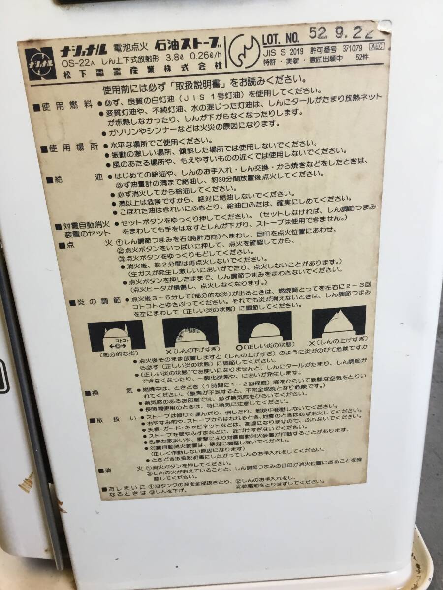 △ 岐阜発/ ナショナル/ 石油ストーブ/ OS-22A/ しん上下式放射形/ 点火確認/ 電池での点火できません/ 3.8/ 現状品/ R6.11/21 △ |