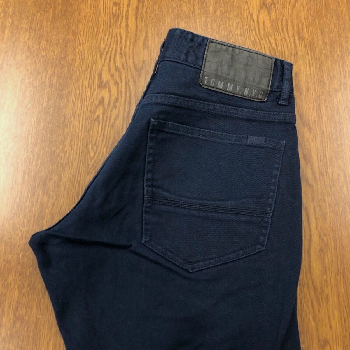 【FK288】TOMMY N.Y.C Mサイズ カラーパンツ ネイビー ストレッチ生地 サイドライン 股上浅め ブランド古着 トミーヒルフィガー 送料無料