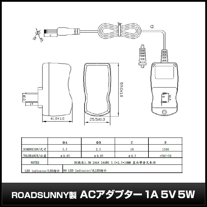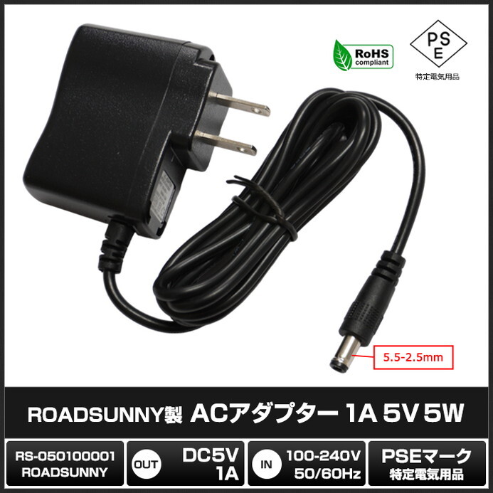 | 6828 ACアダプター 5V/1A/5W 5.5-2.5mm (RS-050100001) AC100~240V ROADSUNNY PSE/RoHS対応 安心の1年保証 | 1個 |
