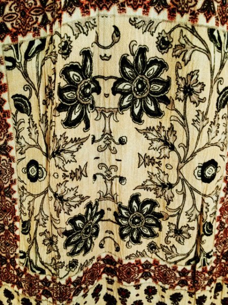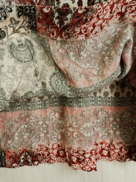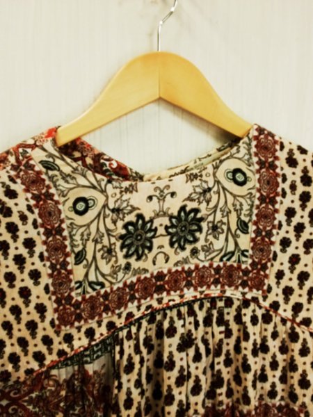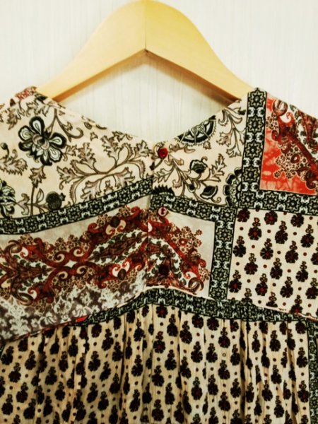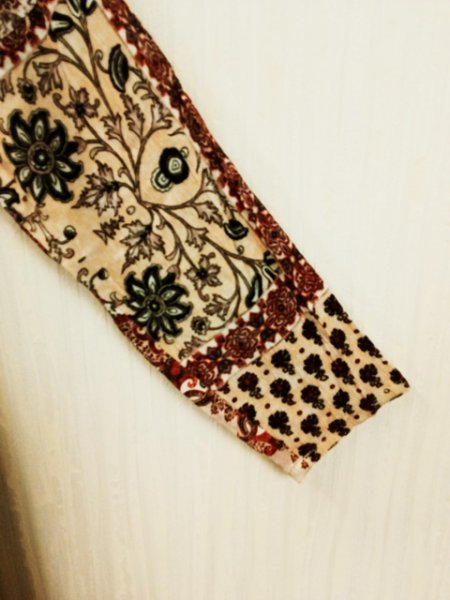 ドロップショルダーと複雑な模様が特徴的な一着です。