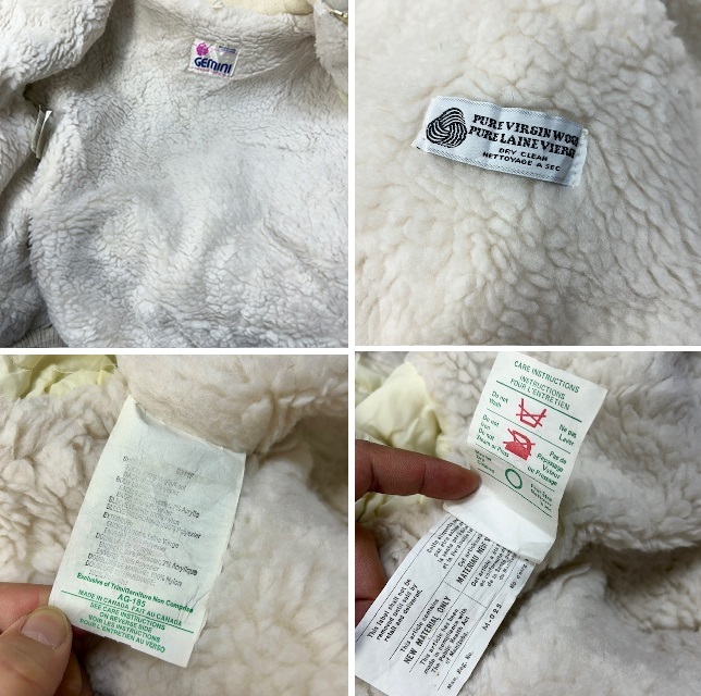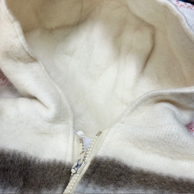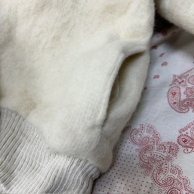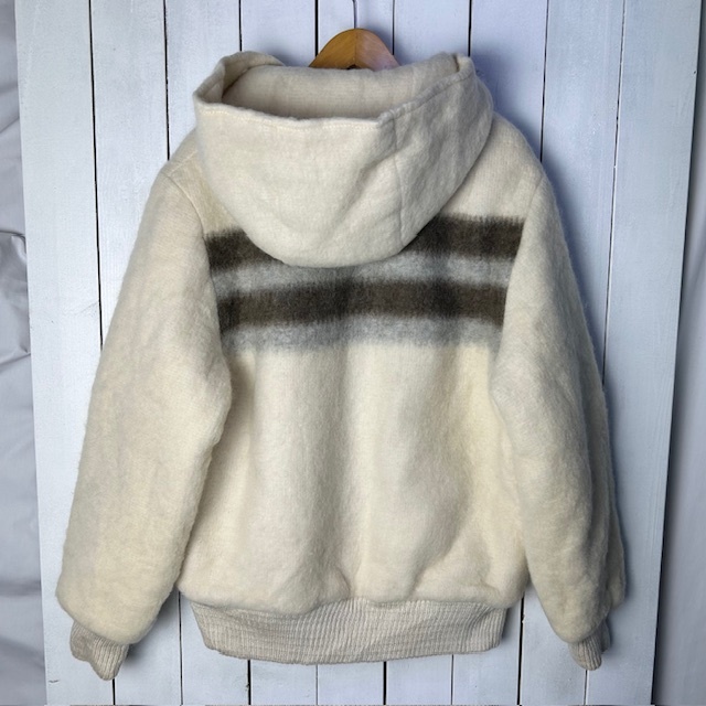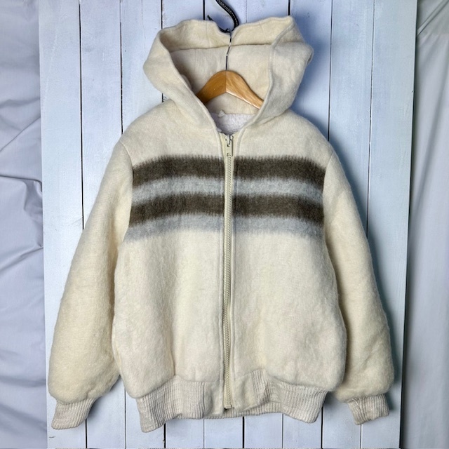 ●商品説明・・・アメリカ古着になります。はっきりした年代は不明ですが70年代~90年代始め頃のオールド・ヴィンテージの冬用の厚手のウールのフード付きボアジャケット・ブルゾンです。フード付きでスタジャン感覚で着ていただける一着です。表はニット生地の表面を起毛させて圧縮したような感じで、裏地はボアになっている暖かな作りのヘビーアウターとして着ていただける一着です。厚手ですが、それほど重量感を感じない着ていただきやすい感じです。ハンドポケット付きです。made in CANADA (カナダ製)で、素材は外がウール100%で、ボア部分がポリとアクリルです。色はオフホワイト~アイボリーのような感じです。サイズは無くユニセックスで着ていただけるシルエット感で、メンズだとやや大きめS~M、レディースだと大きめM~L程度のサイズ感かと思います。