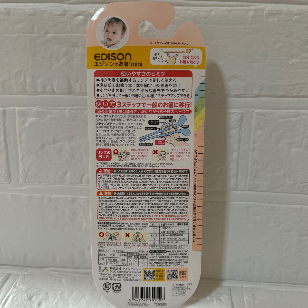 説明初めて使うお箸エジソンのお箸にミニサイズが登場!親指リングの位置を改良。エジソンのお箸がより使いやすくなりました。2歳前の手の小さいお子様でもその日からお箸が上手に使えます。正しい指の角度をサポートするリングの形状だからリングに指を入れるだけですぐに正しく使える。連結部で1本1本のお箸を固定し交差防止。食事をしながら正しい持ち方が身につく。箸先が広く、すべり止め加工で掴みやすい。