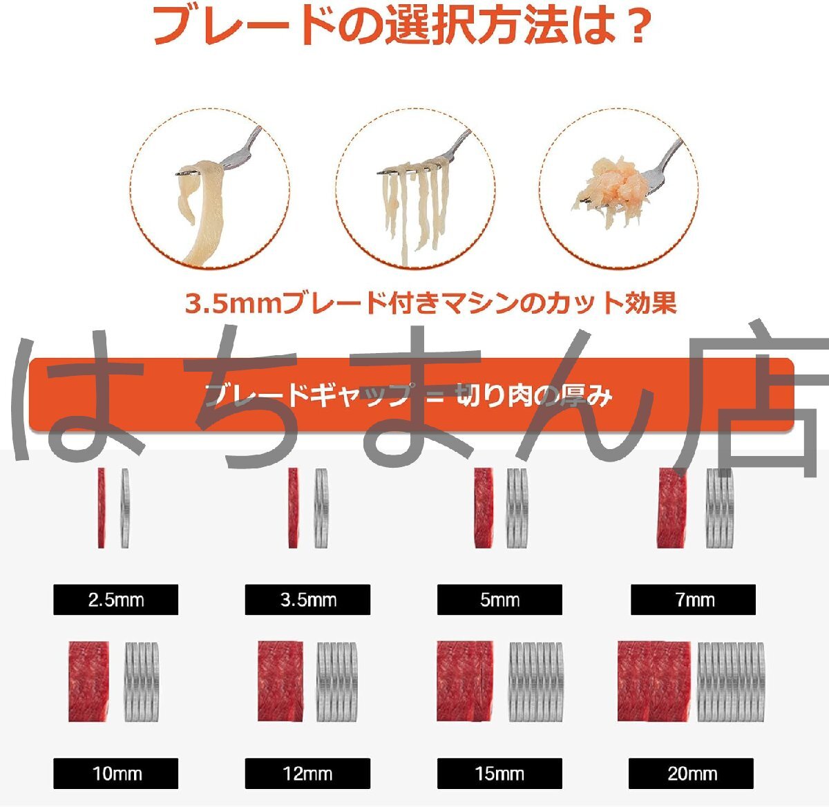 【フリーサイズ】--- 2.5mm-30mmのブレードを選択でき、ブレードの交換も簡単です。肉は1回目はスライス、2回目は細断になる、3回目は不規則な肉の立方体、次はひき肉にカットされます。3.5mmは、鶏の胸肉をカットする最良の選択です。