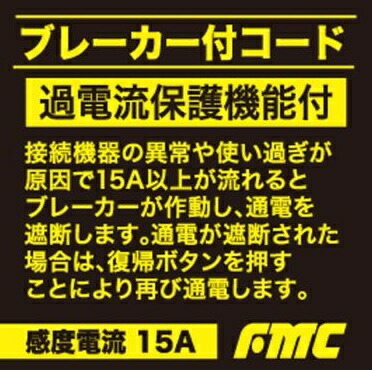 フジマック FUJIMACブレーカー付きコード 10MHB-1510-B ブルー■特長1.電気を使いすぎた時に通電を遮断するブレーカー付。2.LEDランプの光で通電確認ができる。■電線仕様・VCT1.25平方ミリメートル・2芯・保護機能:過負荷(使いすぎ)15A・電線長さ:10m・コンセント:4ツ口