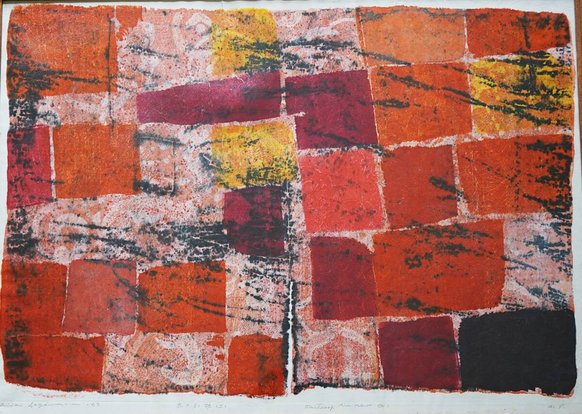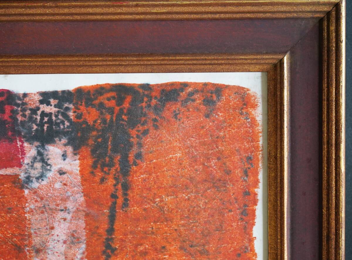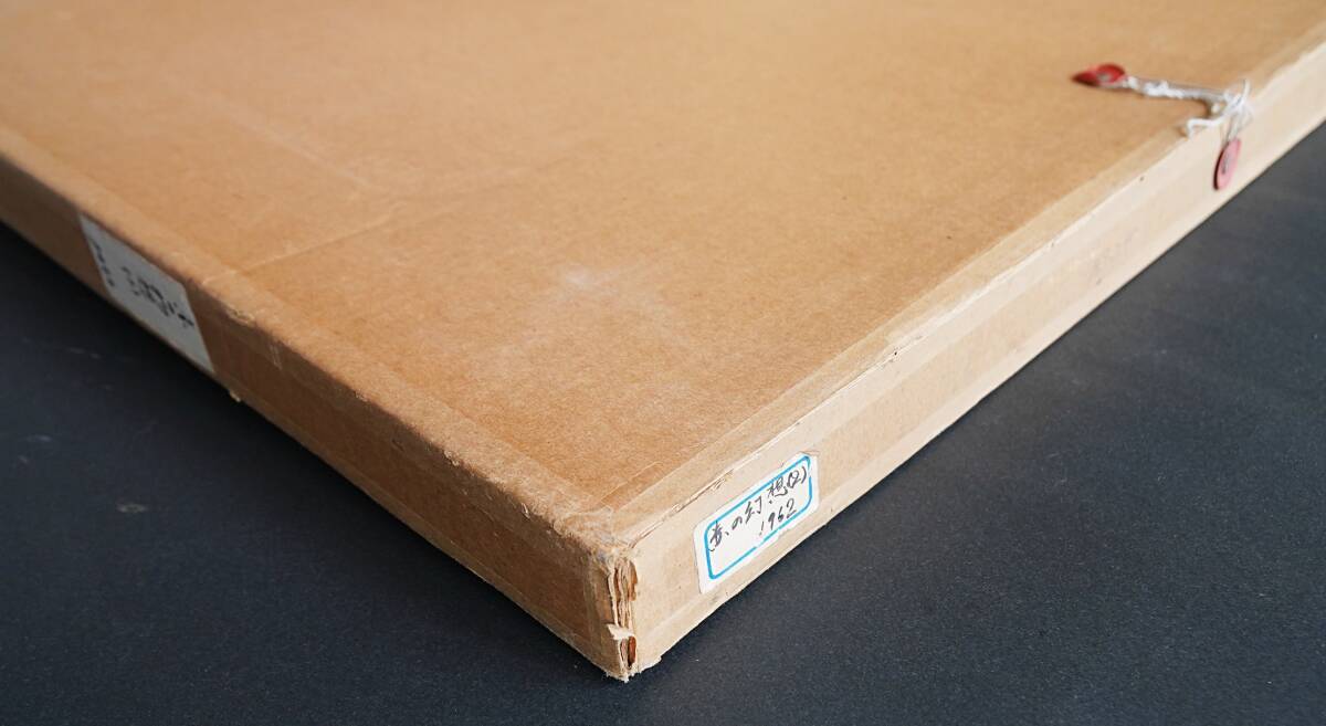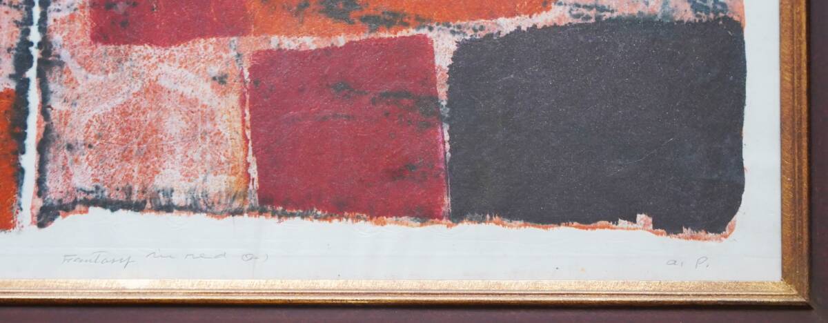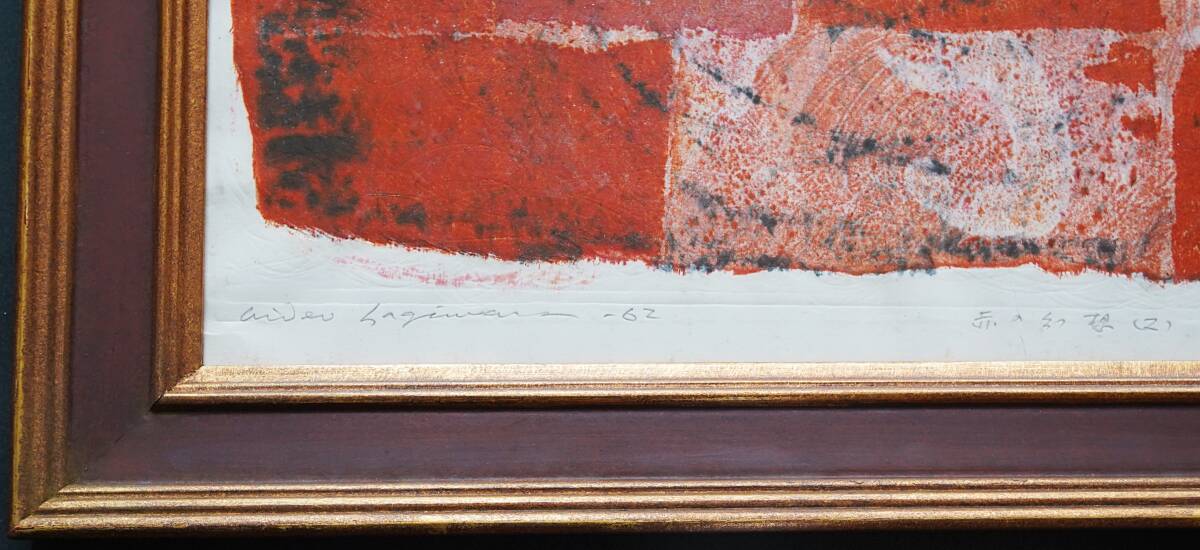 『赤の幻想No.2 Fantasy in Red(2)』 1962年制作 木版画1枚(版木:3版10色 用紙:鳥の子紙 両面刷り) 限定30部 A.P.版(作家保存版) マージン部に直筆サイン入り 額サイズ:(約)96.2x64.6cm 窓サイズ:(約)93x61cm ●萩原英雄[はぎわら ひでお、1913年(大正2年)- 2007年(平成19年)]山梨県甲府市出身、画家、木版画家。 元日本版画協会理事長、日本版画協会名誉会員。紫綬褒章、勲四等旭日小綬章受章。 1933年4月に東京美術学校(現・東京藝術大学美術学部)油絵科へ入学、白日会, 光風会に油彩画が入選しました。 1938年3月に卒業後、同年4月に高見沢木版社に入社しました。企画部を担当し、浮世絵版画の技法について多くを学びました。 1943年6月に軍事召集を受けて高見沢出版社を退社しました。 戦後は、高見沢木版社時代に学んだ技法で木版画制作を開始しました。 木版画に油絵の持つ色彩の深さを加えるため、「木版凹版」「両面刷り」の技法を開発し、抽象木版画を制作しました。 1960年に第2回東京国際版画ビエンナーレで「石の花」シリーズが神奈川県近代美術館賞、 1962年に第7回ルガノ国際版画ビエンナーレで「白の幻想 No.1」がグランプリを受賞、 1963年には第5回リュブリアナ国際版画ビエンナーレで「白の幻想 No.2」がユーゴスラビア科学芸術アカデミー賞を受賞するなど、国内外で抽象版画家としての地位を確立しました。 具象木版画にも貪欲に取り組み、1981年から1986年に渡って、北斎の「富嶽三十六景」に触発された全36図の連作「三十六富士」を制作しました。 「三十六富士」では雲母摺りや空摺りといった浮世絵の伝統的手法や木版に、おがくずを貼る,ニスを塗布するなどの技法を用いて、故郷である富士山の様々な風景を描きました。 その後、1990年から1998年にかけて、「拾遺富士シリーズ」と「大富士シリーズ」を制作しました。※本作品が万一、公定鑑定人、または公定鑑定機関により、 真作でないという判断がされた場合は、返品・全額返金を受け付けます。 ※商品ご落札日より1週間以内に鑑定される旨をご連絡下さい。 ※鑑定料、鑑定に伴う諸経費は落札者様のご負担となりますので予めご了承下さい。 ■コンディション 差し箱に破れ、額に小傷みが有ります。 ■発送方法 送料:全国一律2000円