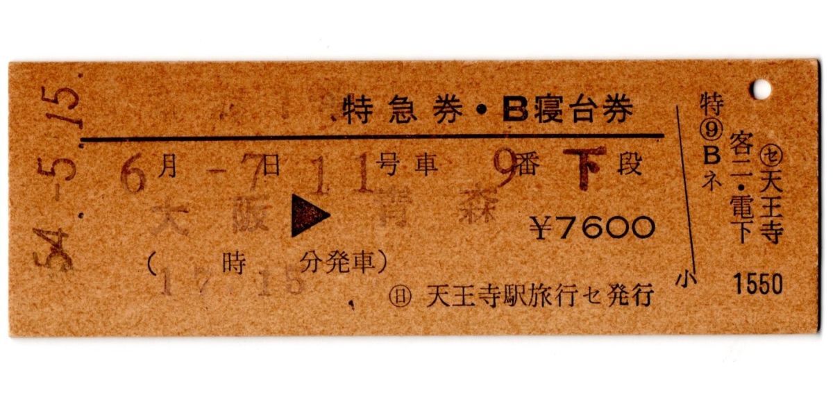 D型券 日本海1号 特急券・B寝台券 ¥7600 大阪→青森 検札印