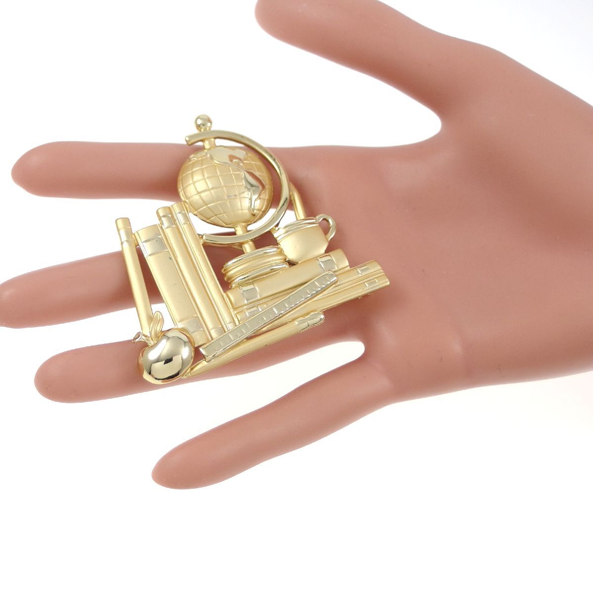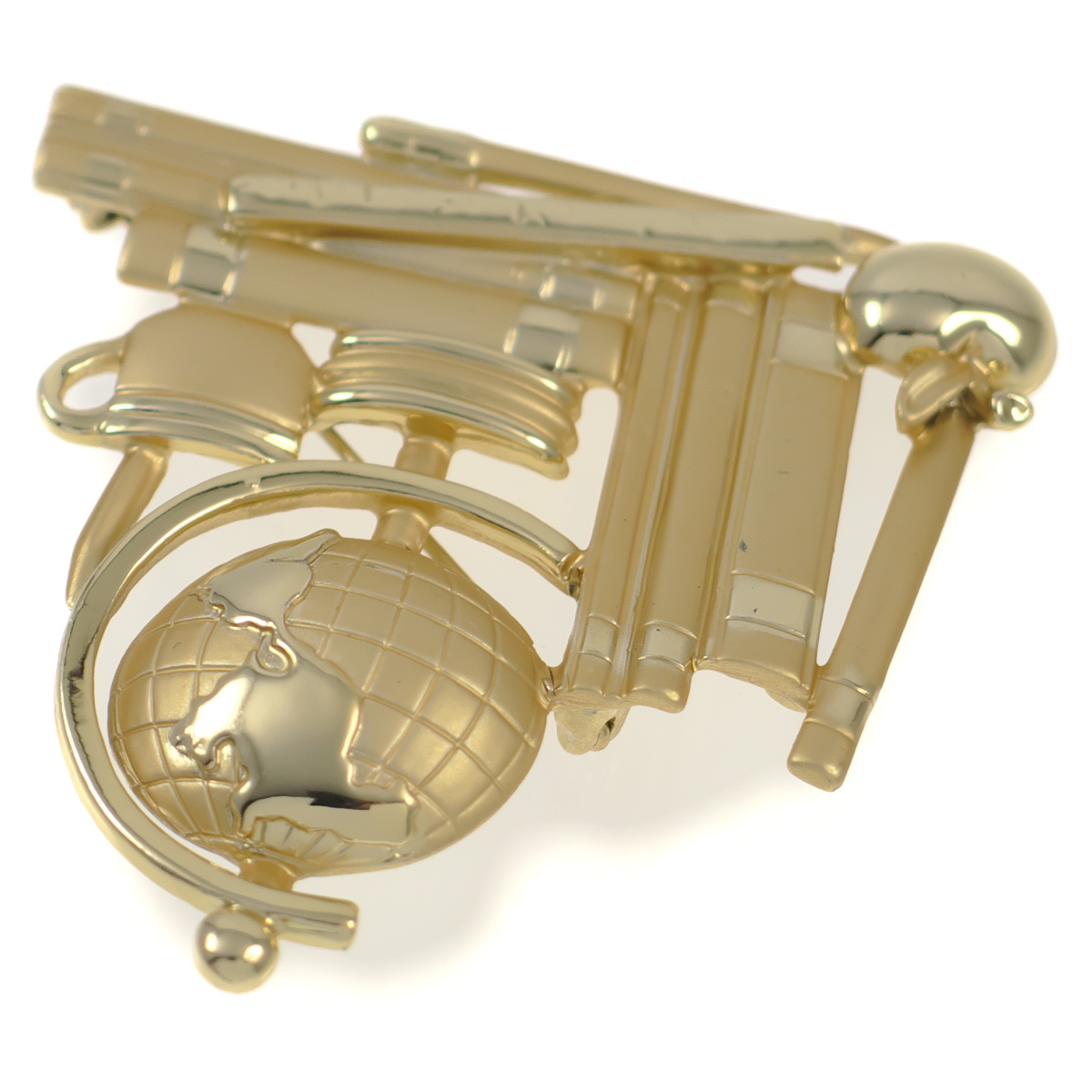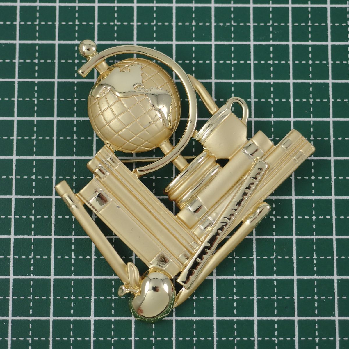 A10274◆【DANECRAFT】◆ 教授の机上モチーフ 地球儀 本 リンゴ ペン 艶消しゴールドトーン ◆ ヴィンテージブローチ ◆