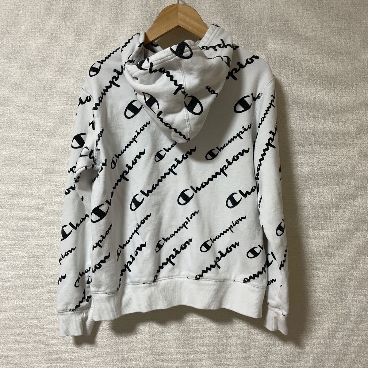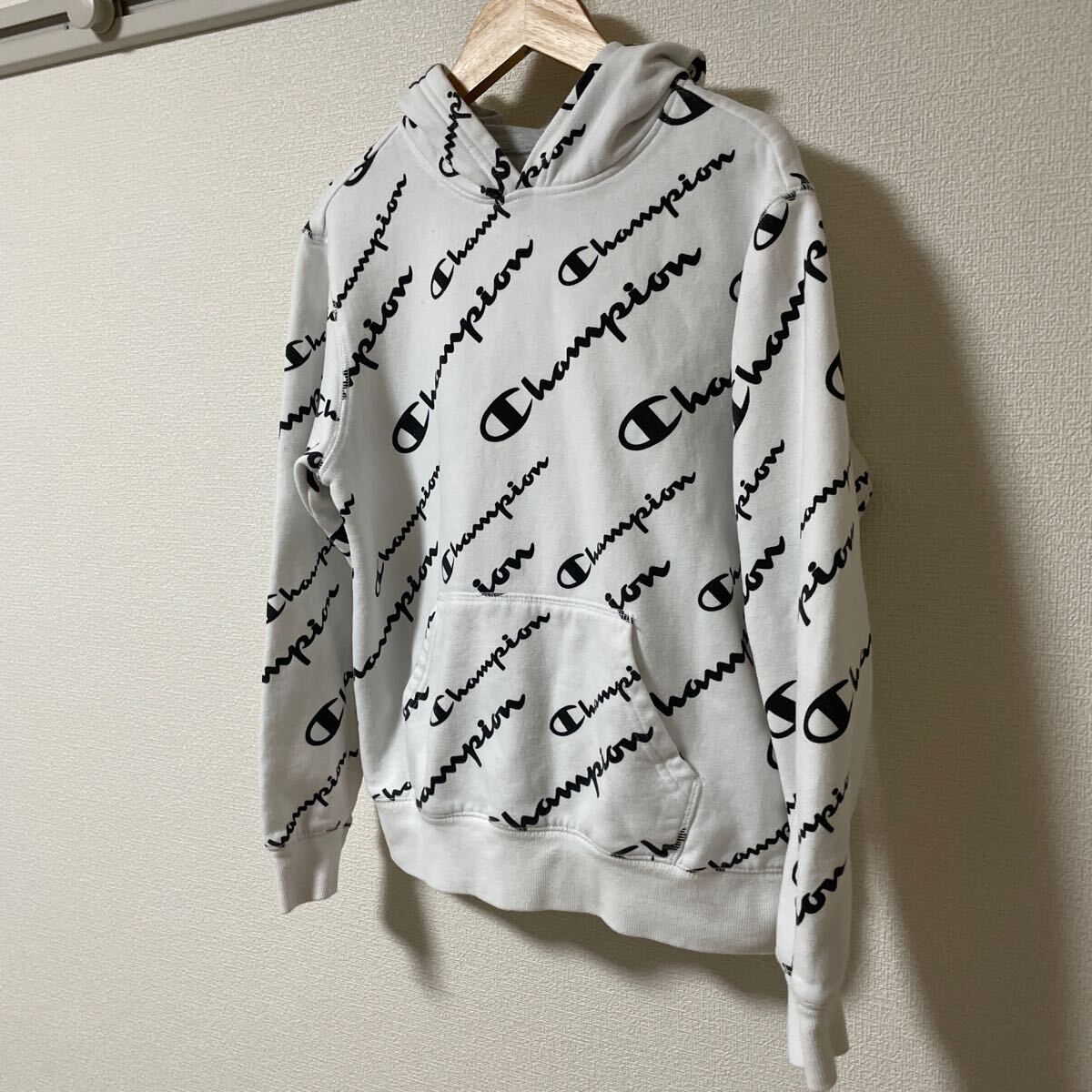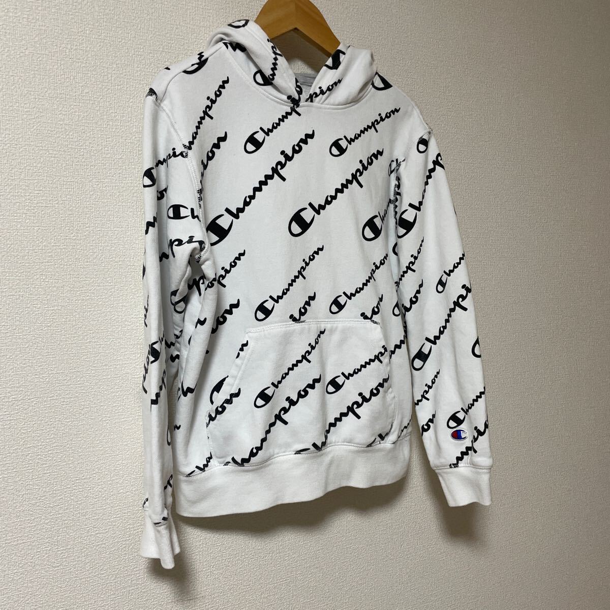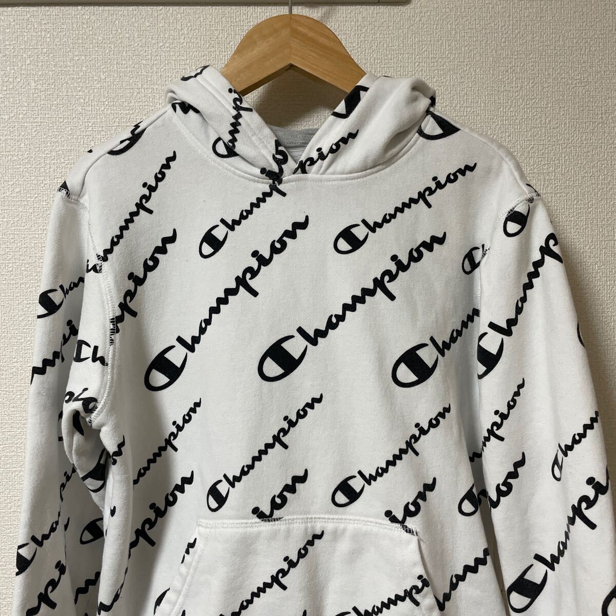 ホワイトのChampionロゴが特徴的なフード付きパーカー。